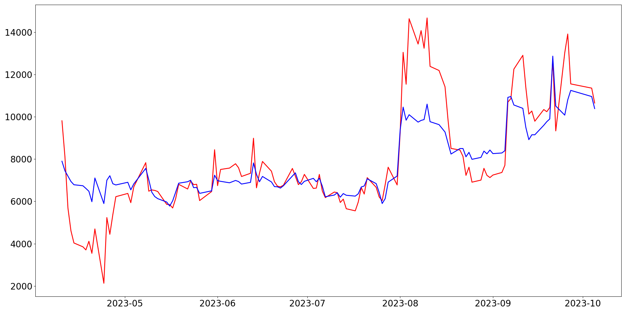 [ - : 실제값(종가) / - : 예측값(종가) ]