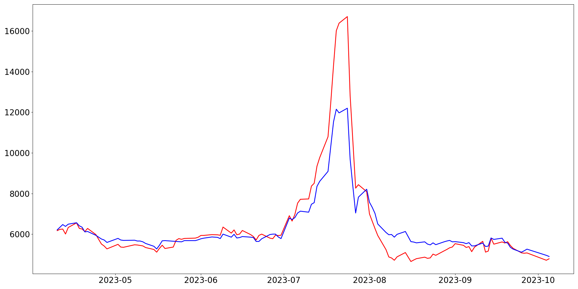 [ - : 실제값(종가) / - : 예측값(종가) ]