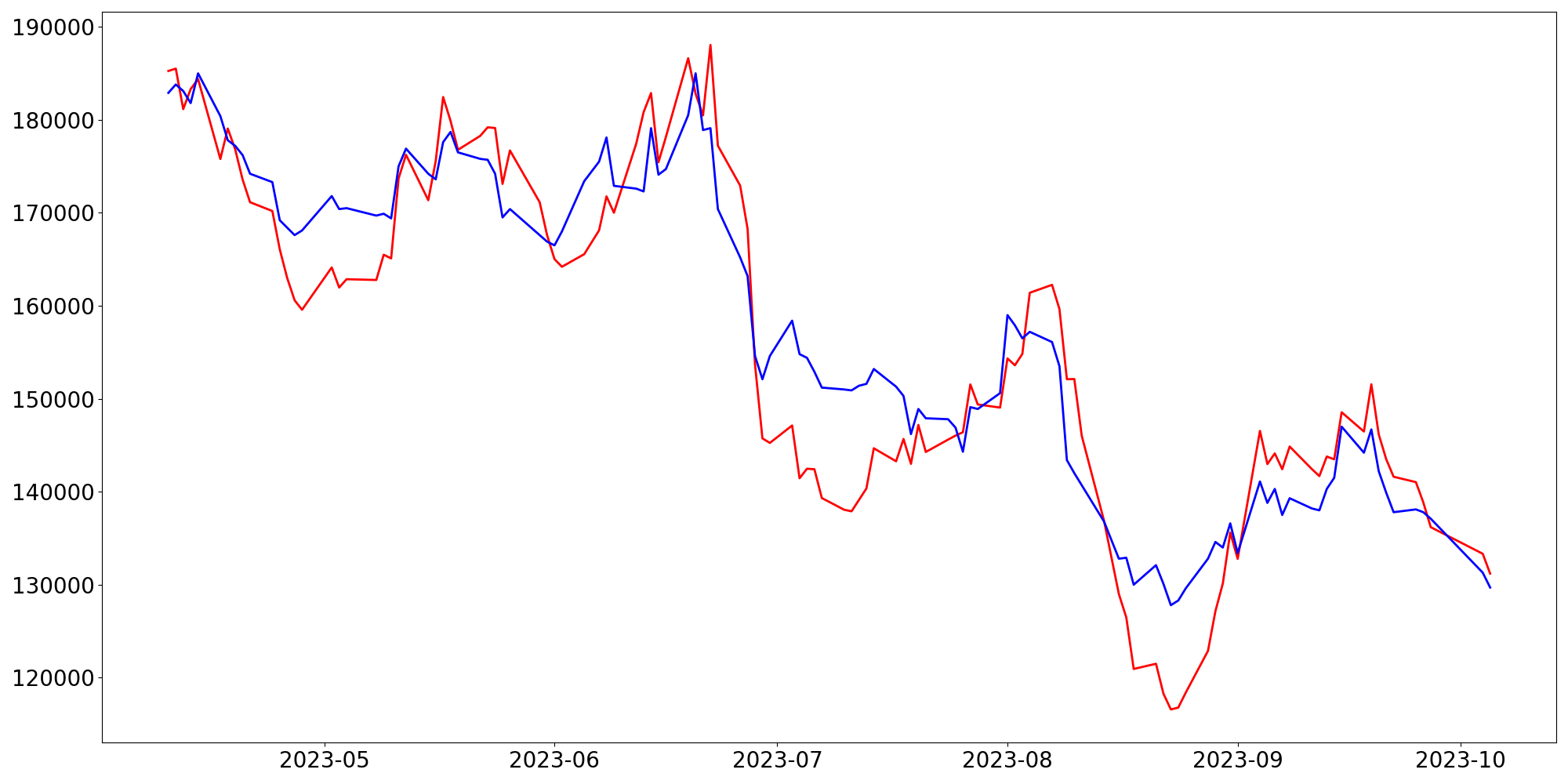 [ - : 실제값(종가) / - : 예측값(종가) ]