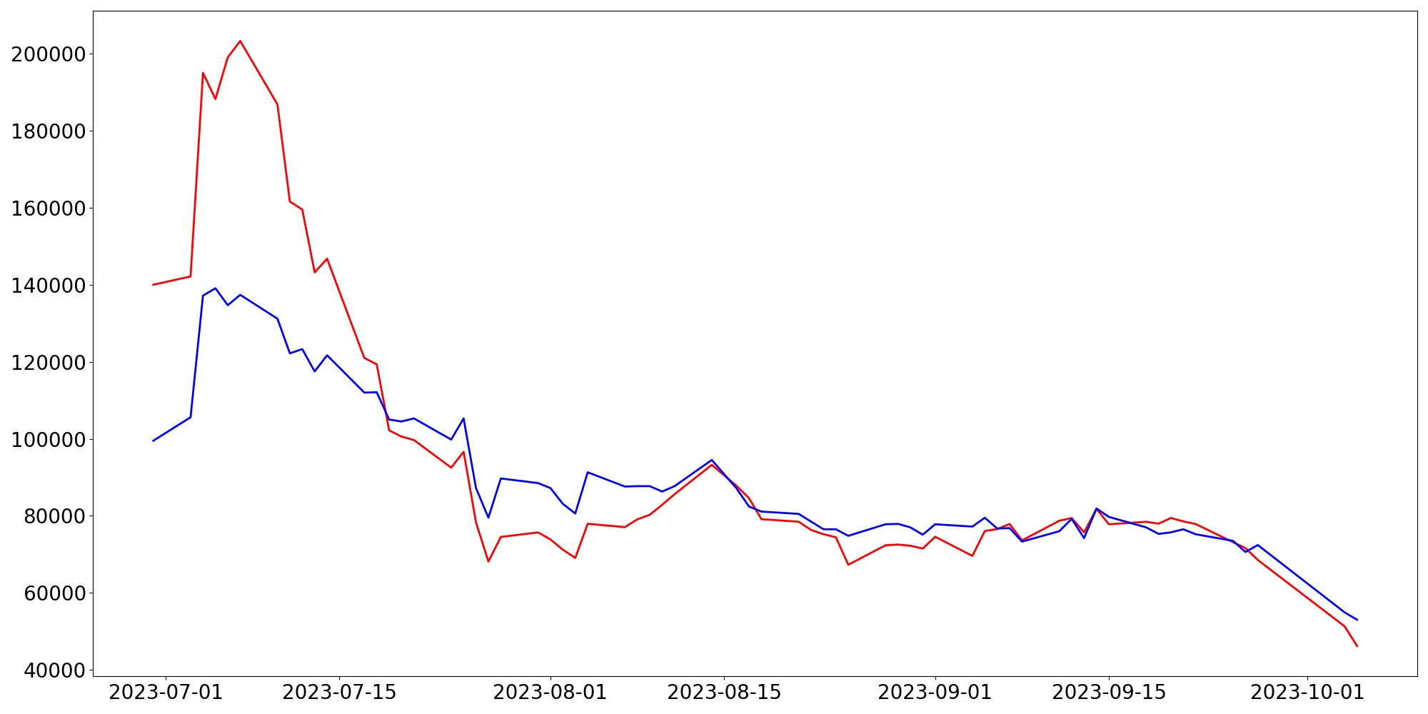 [ - : 실제값(종가) / - : 예측값(종가) ]