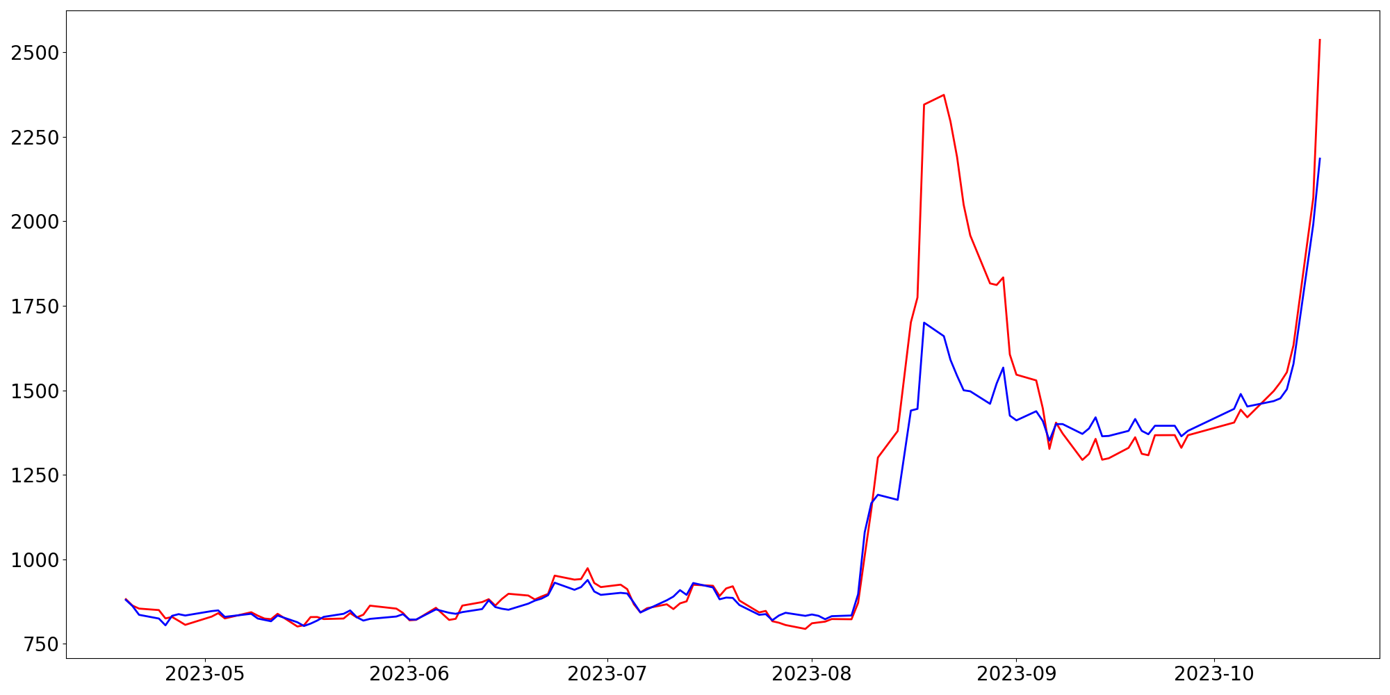 [ - : 실제값(종가) / - : 예측값(종가) ]