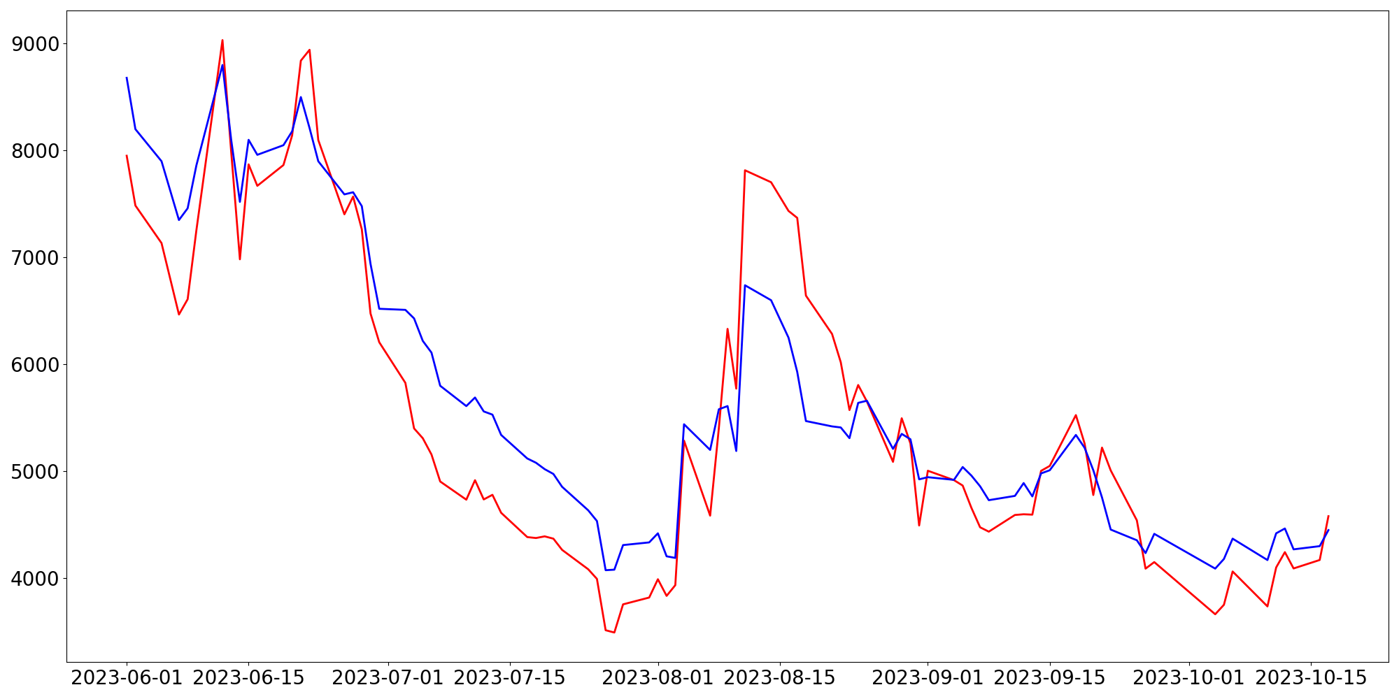 [ - : 실제값(종가) / - : 예측값(종가) ]