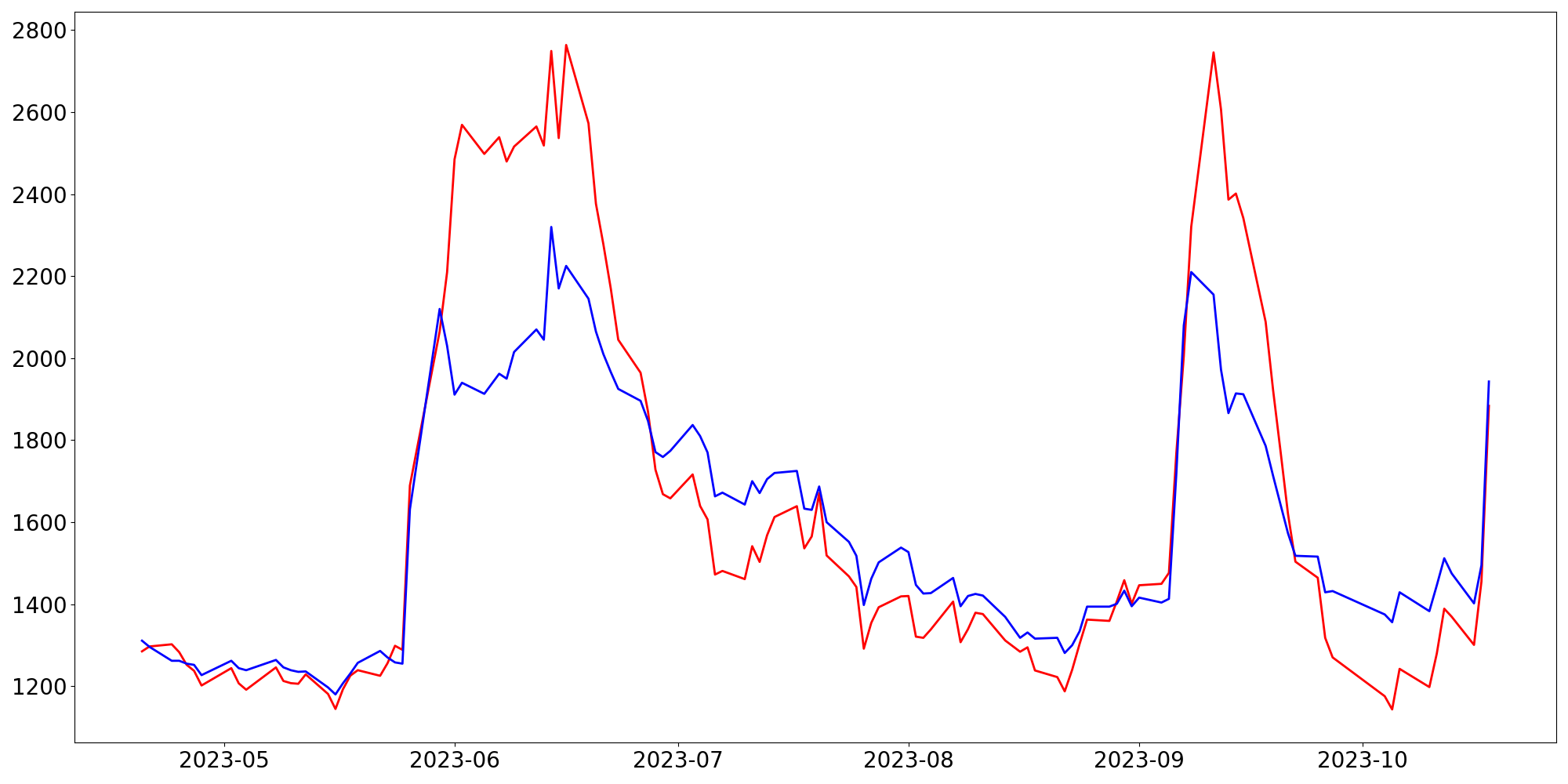 [ - : 실제값(종가) / - : 예측값(종가) ]
