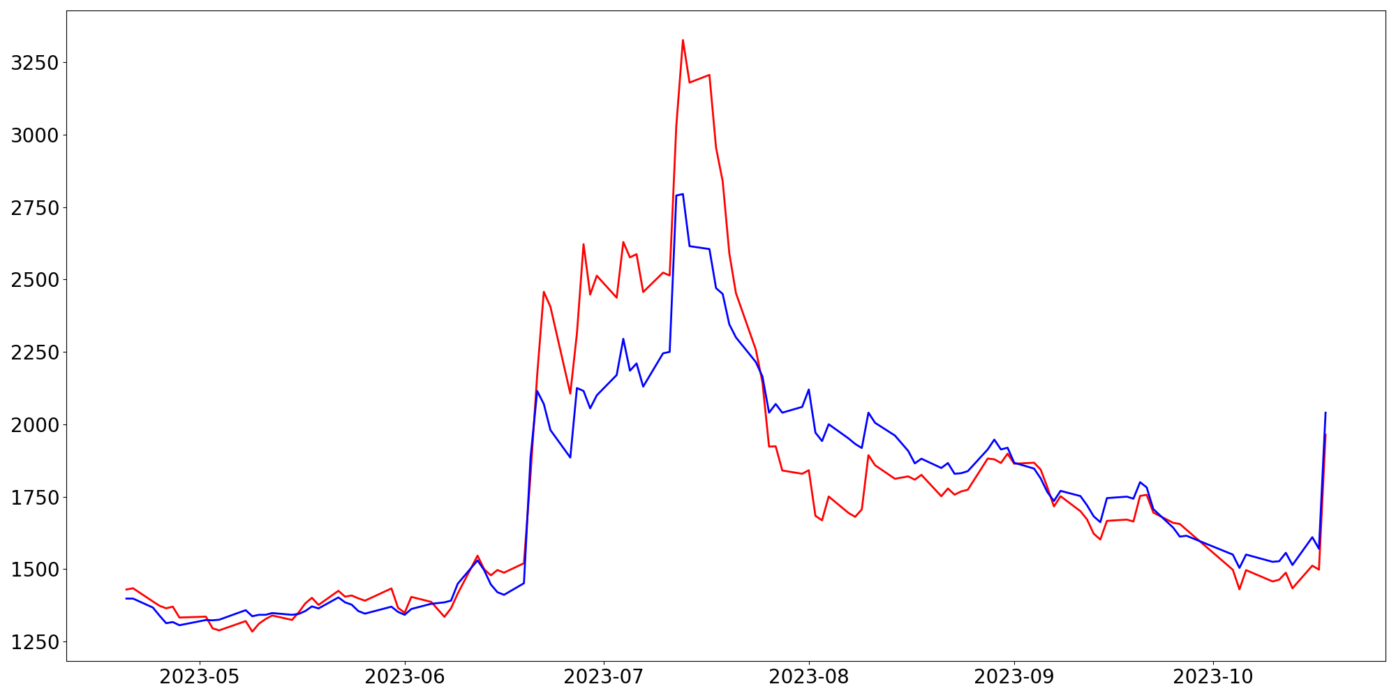 [ - : 실제값(종가) / - : 예측값(종가) ]