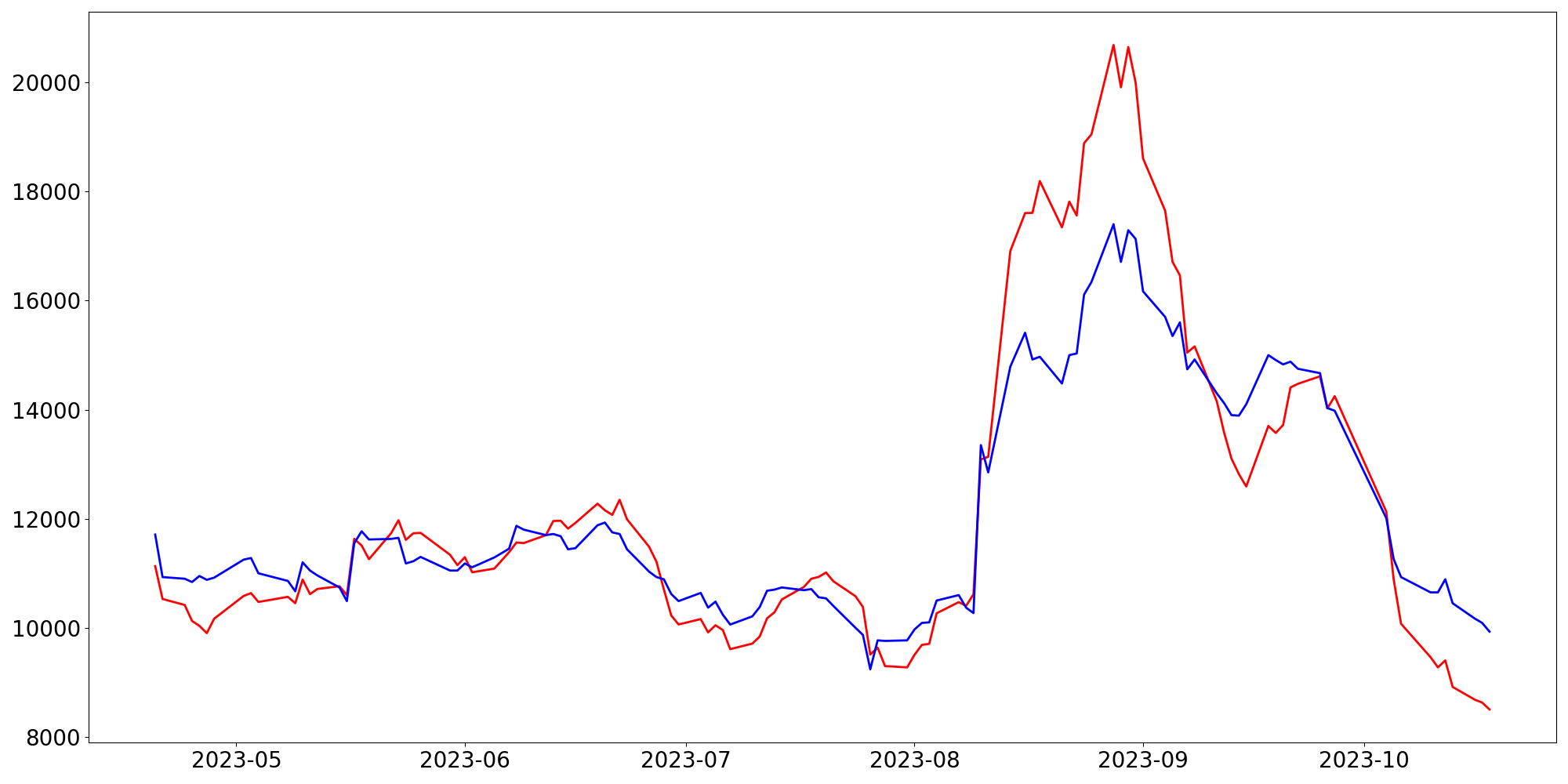 [ - : 실제값(종가) / - : 예측값(종가) ]