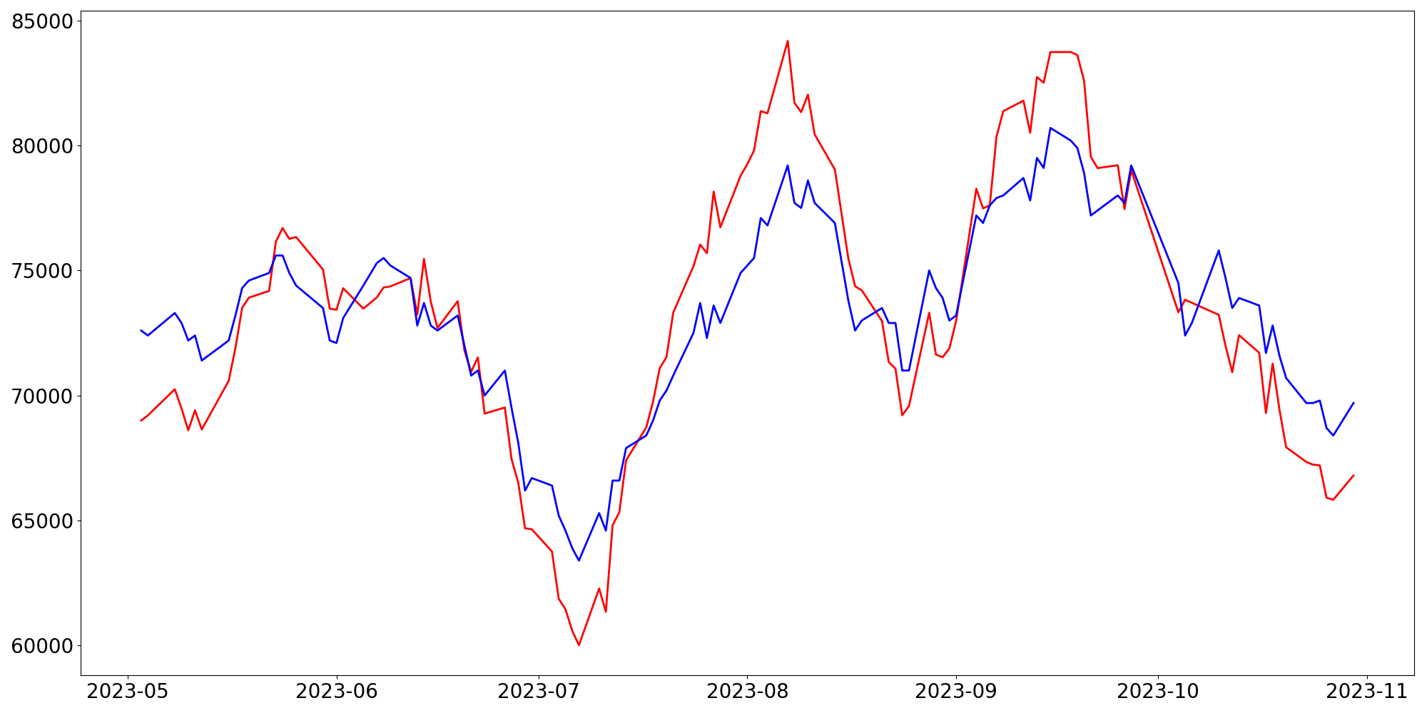 [ - : 실제값(종가) / - : 예측값(종가) ]