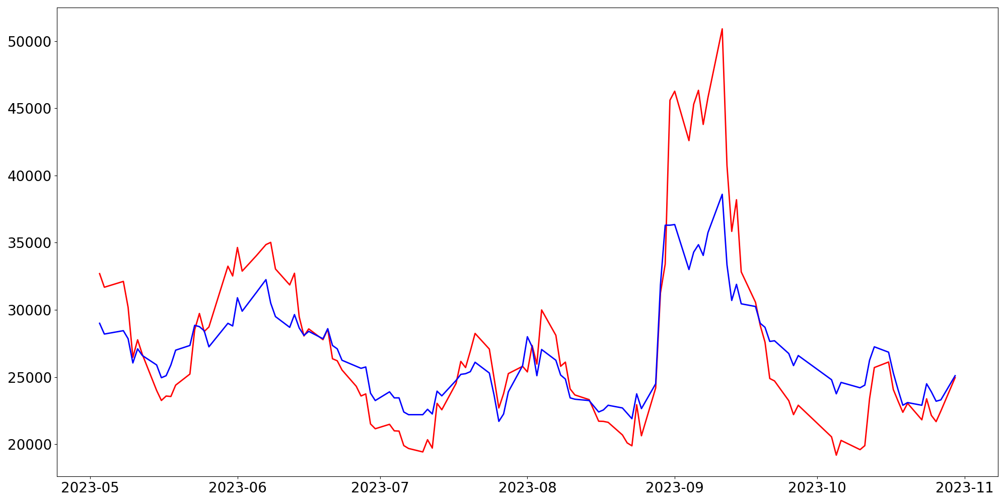 [ - : 실제값(종가) / - : 예측값(종가) ]