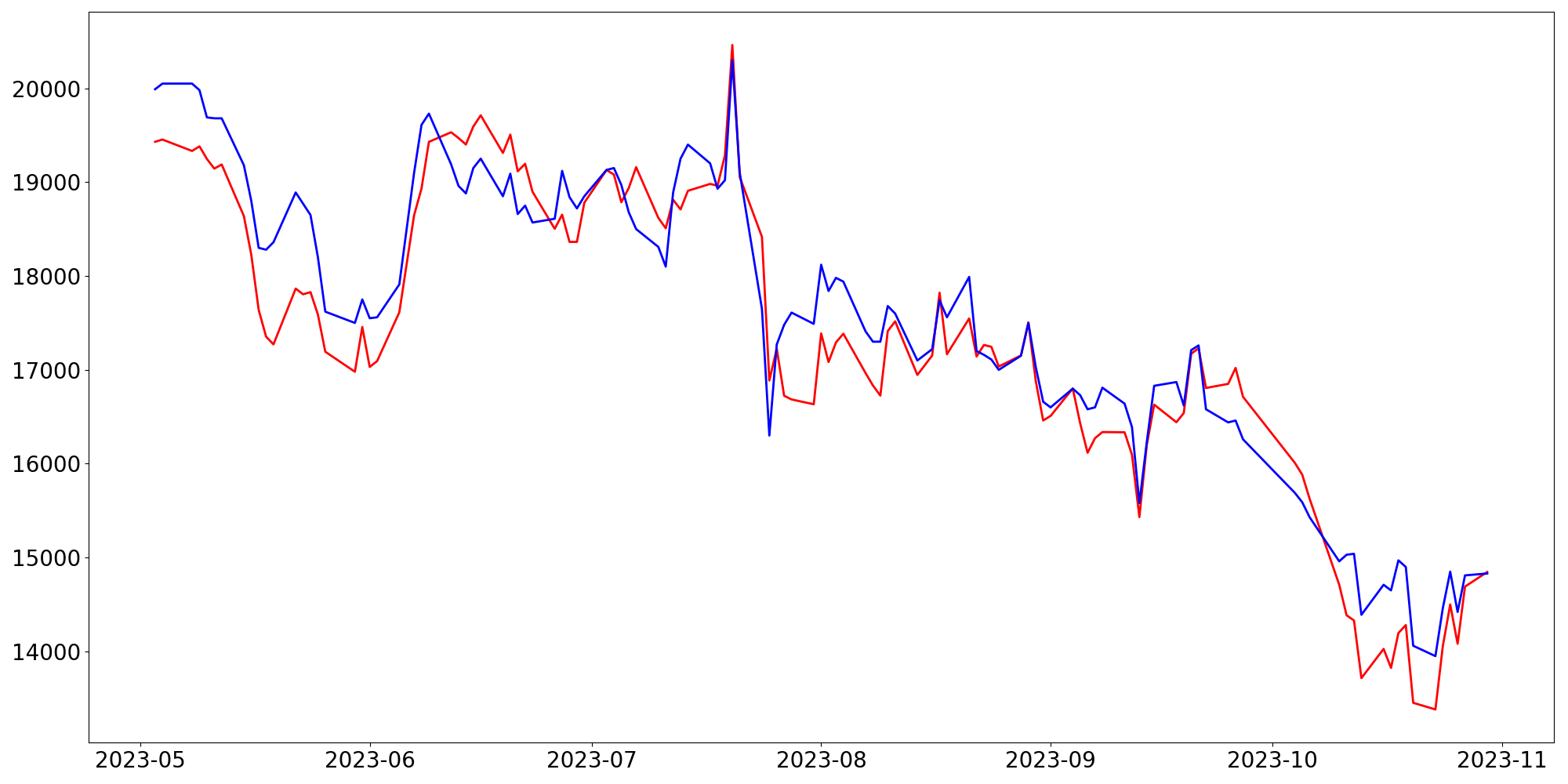 [ - : 실제값(종가) / - : 예측값(종가) ]