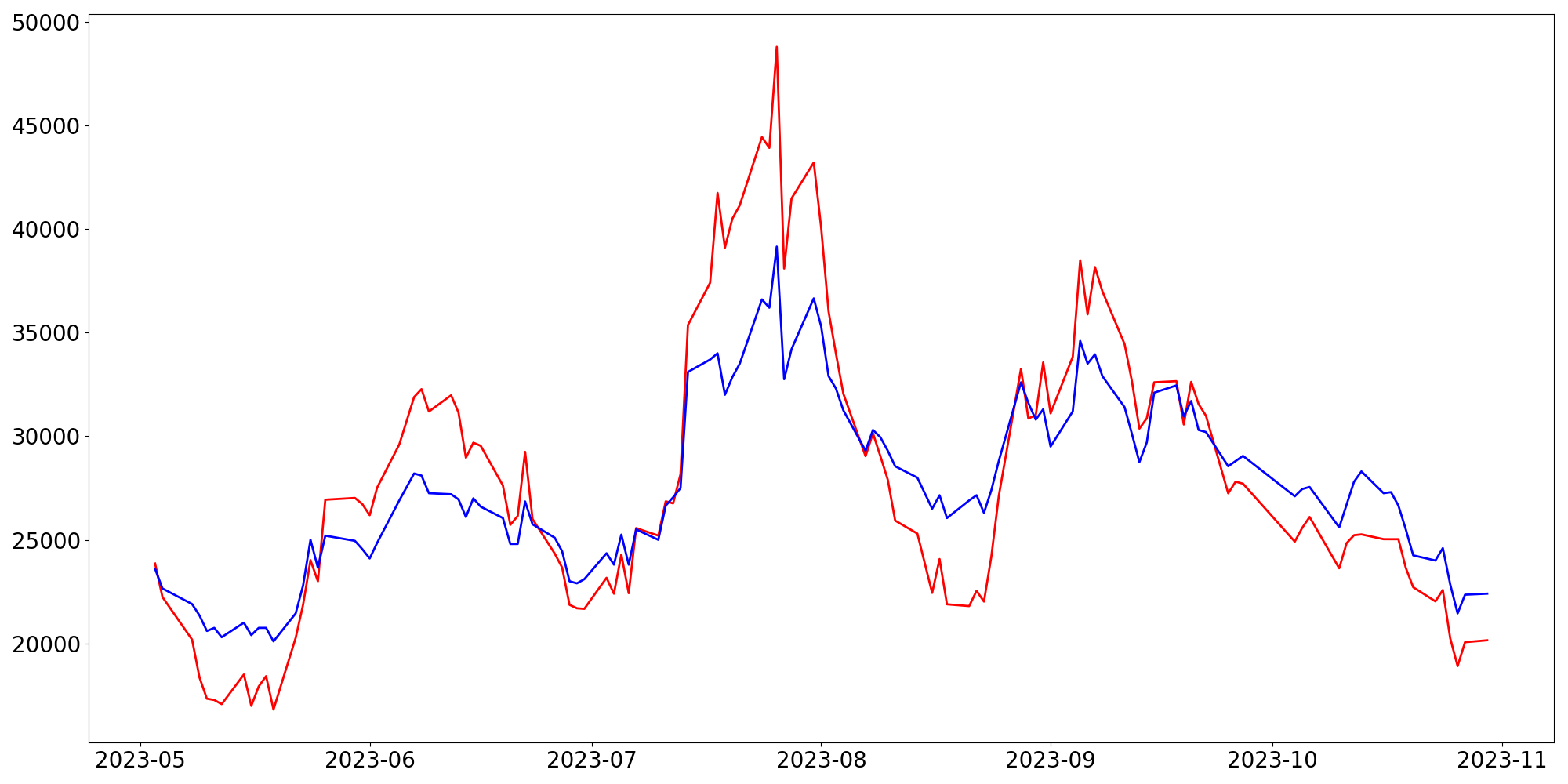 [ - : 실제값(종가) / - : 예측값(종가) ]