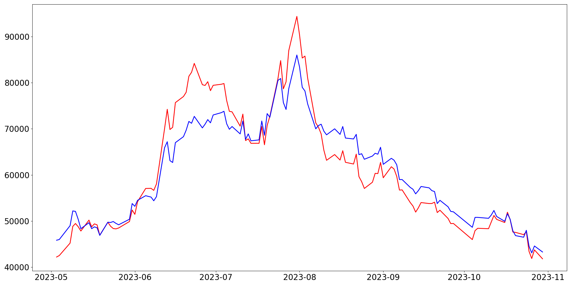 [ - : 실제값(종가) / - : 예측값(종가) ]