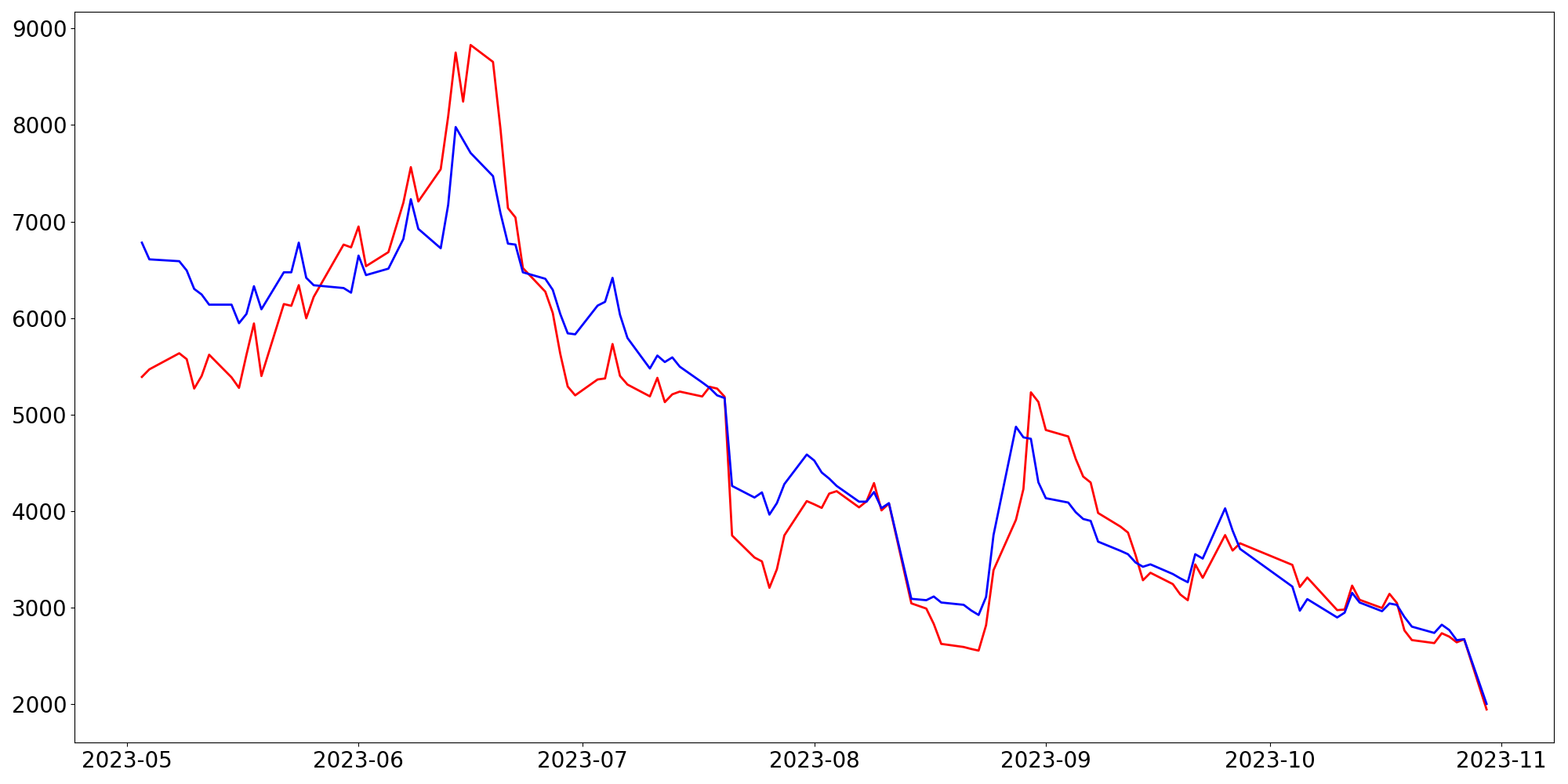 [ - : 실제값(종가) / - : 예측값(종가) ]