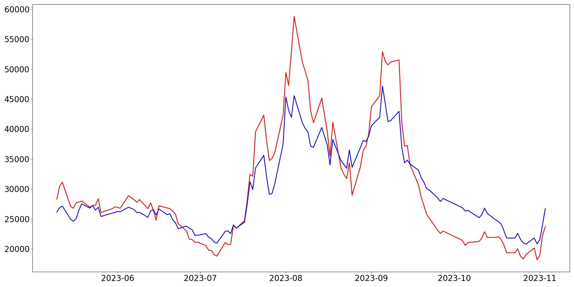 [ - : 실제값(종가) / - : 예측값(종가) ]