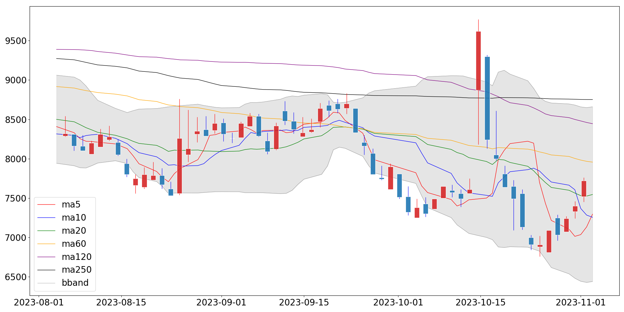 □ 장기 : 현재 종가가 장기(250일) 이동평균값(8,752원)을 하회 하여 장기적 추세 하락 중