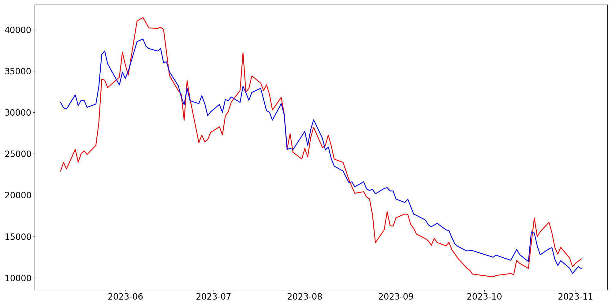 [ - : 실제값(종가) / - : 예측값(종가) ]
