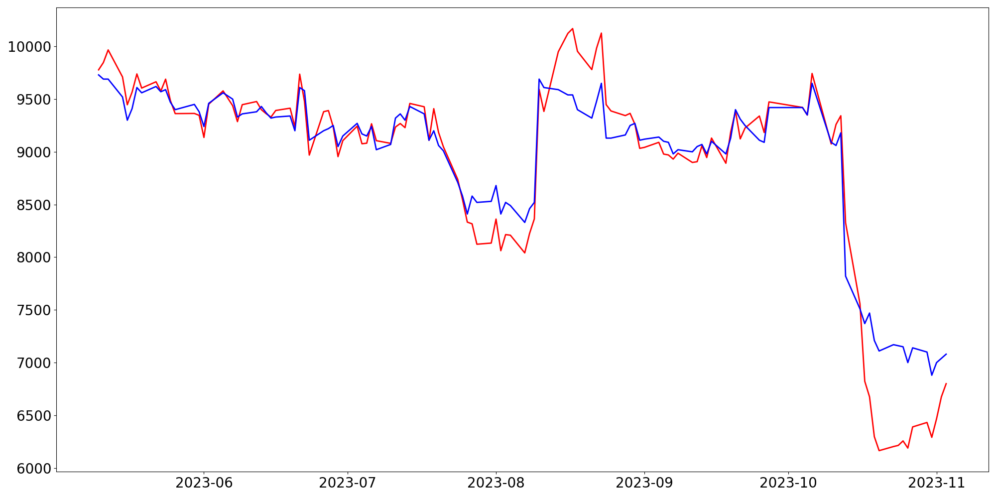 [ - : 실제값(종가) / - : 예측값(종가) ]