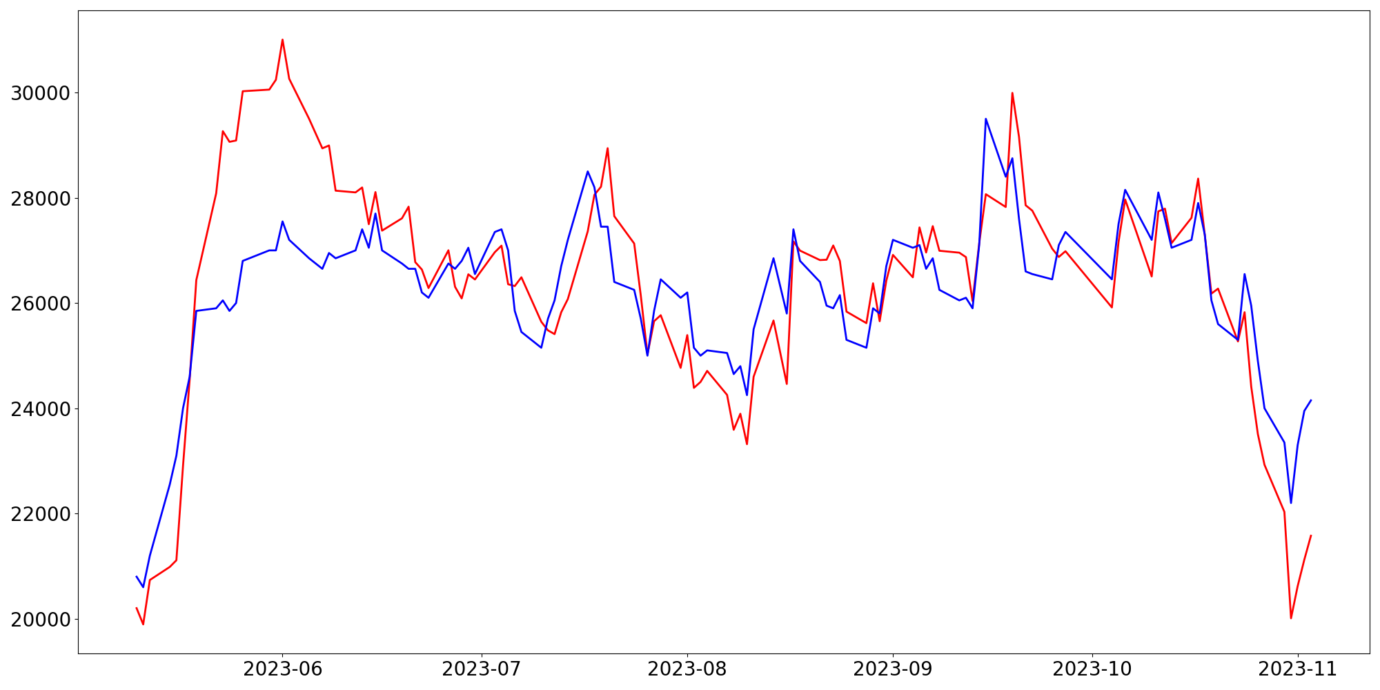 [ - : 실제값(종가) / - : 예측값(종가) ]