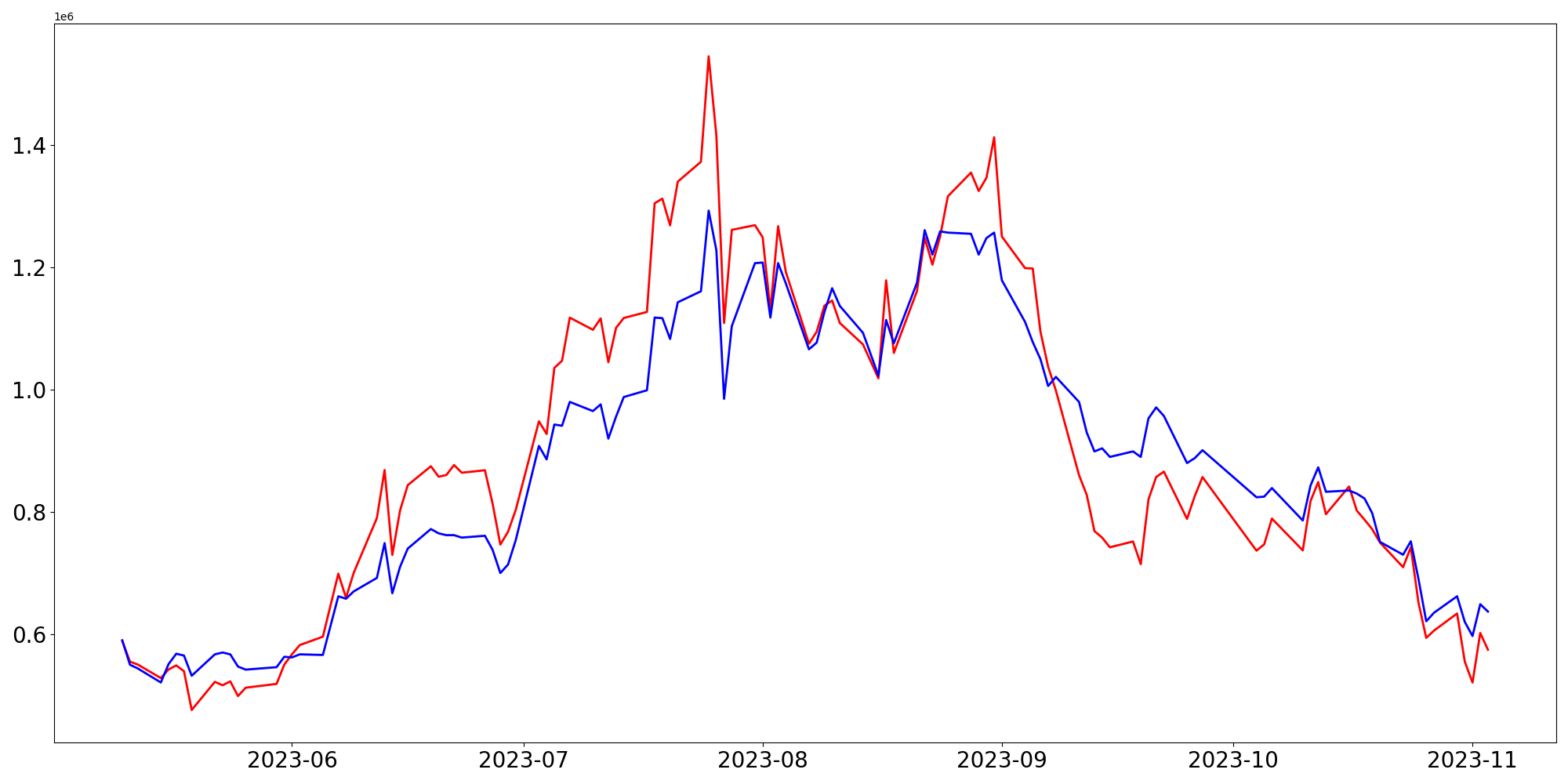 [ - : 실제값(종가) / - : 예측값(종가) ]