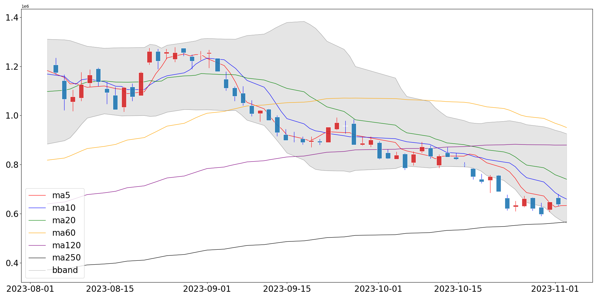 □ 중기 : 현재 종가가 중기(60일) 이동평균값(950,767원)을 하회 하여 중기적 추세 하락 중