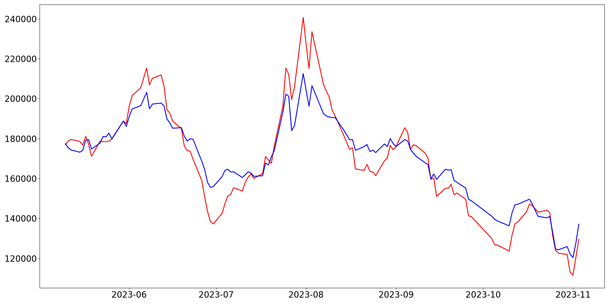 [ - : 실제값(종가) / - : 예측값(종가) ]