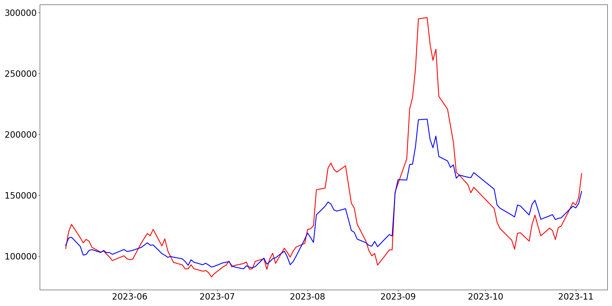 [ - : 실제값(종가) / - : 예측값(종가) ]