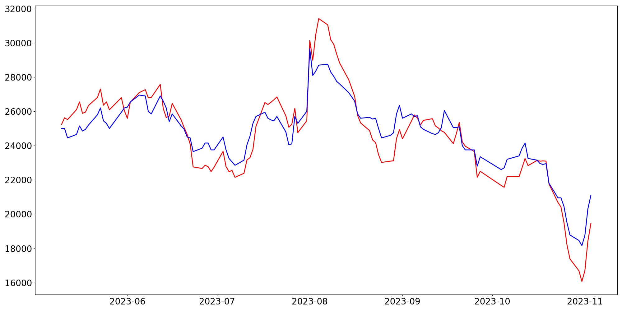 [ - : 실제값(종가) / - : 예측값(종가) ]