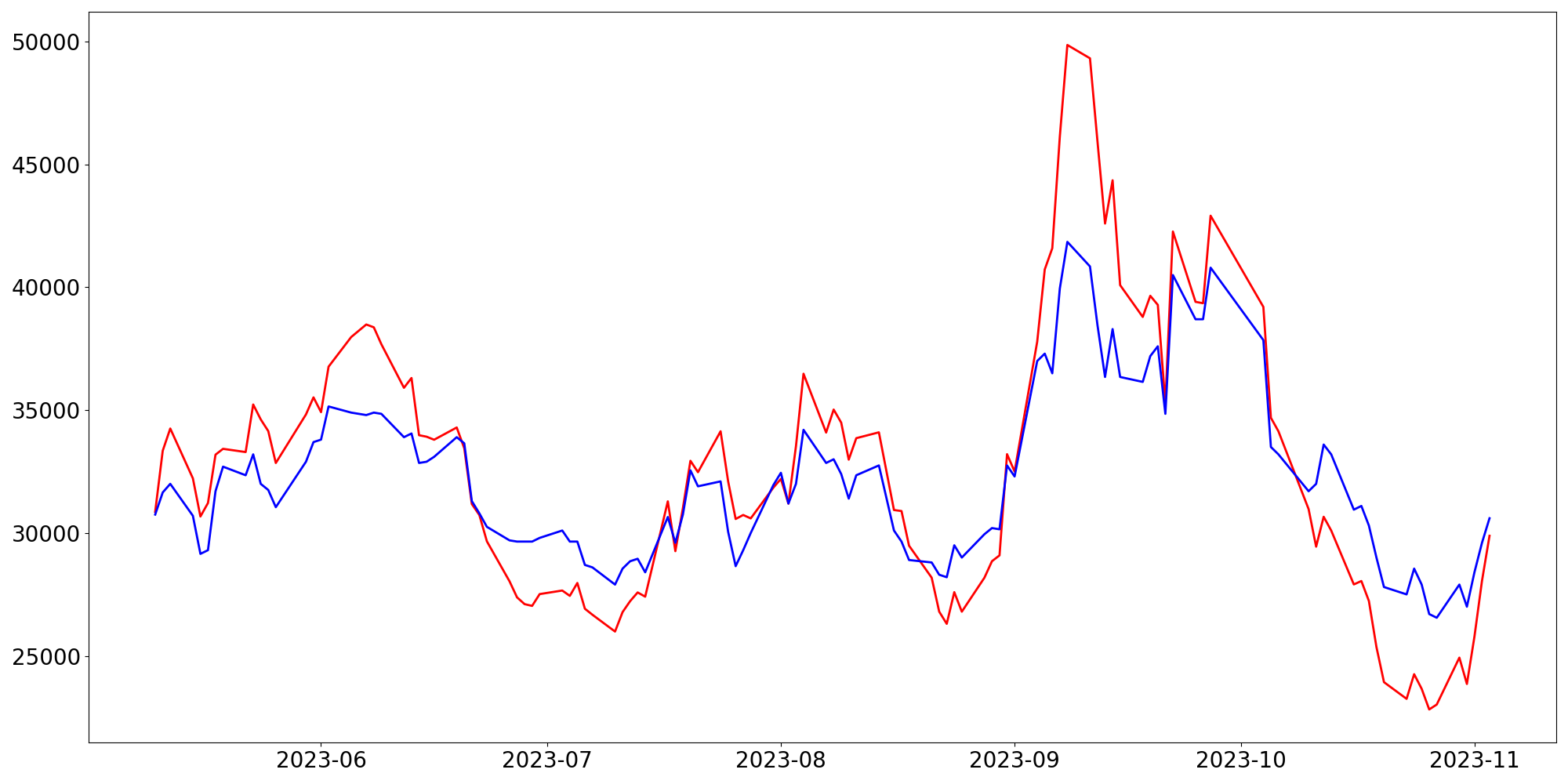 [ - : 실제값(종가) / - : 예측값(종가) ]