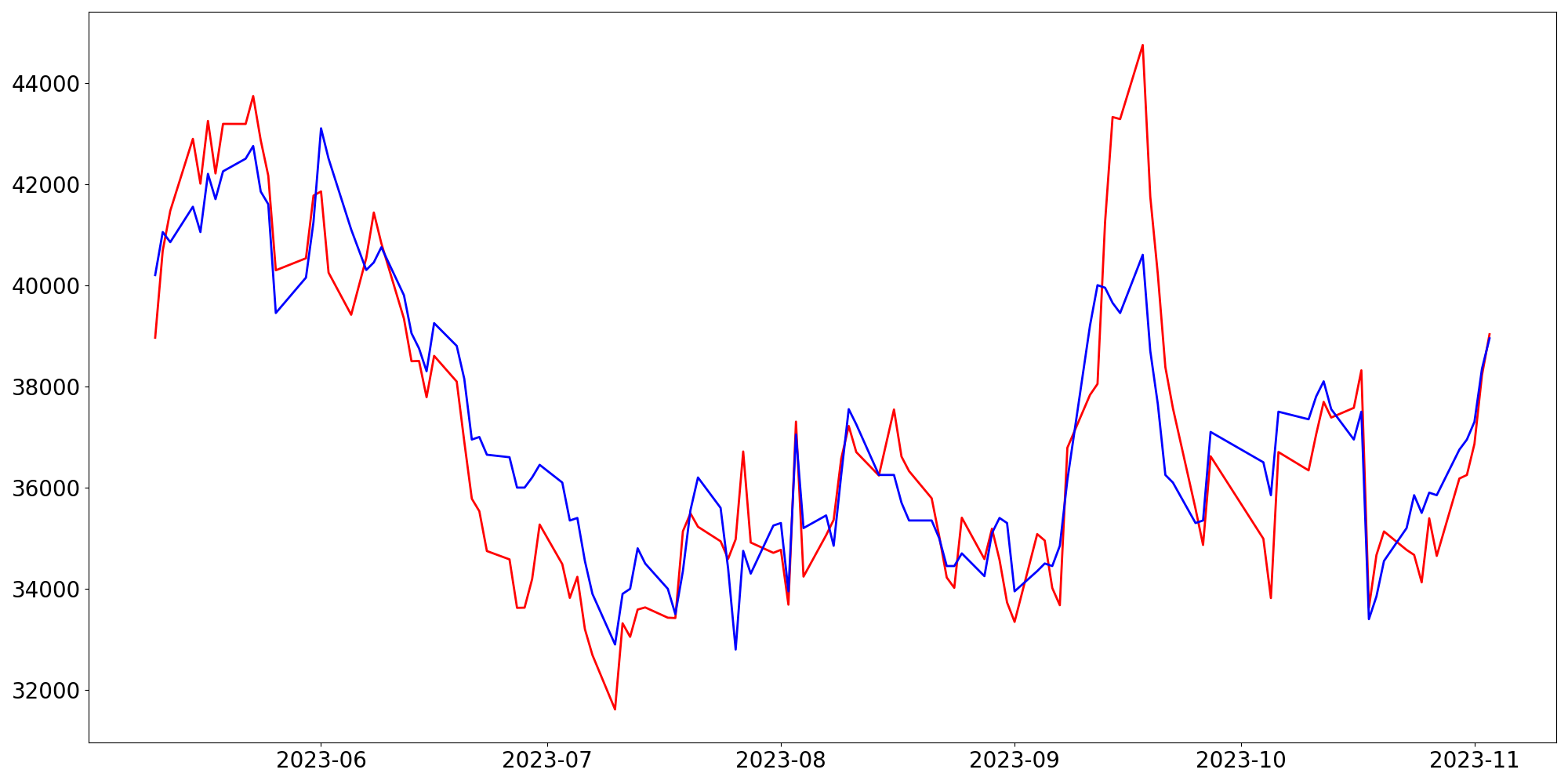 [ - : 실제값(종가) / - : 예측값(종가) ]