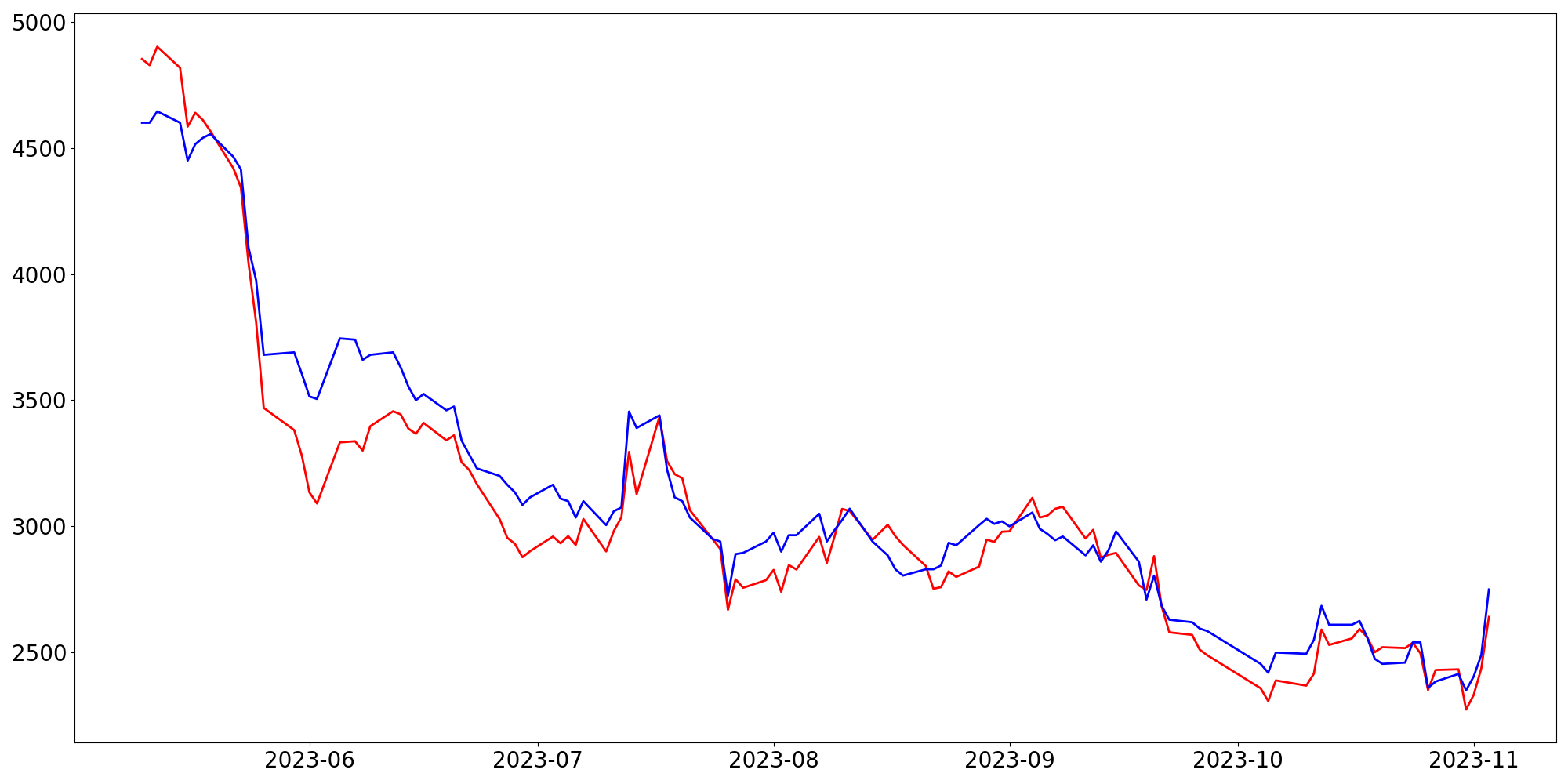 [ - : 실제값(종가) / - : 예측값(종가) ]