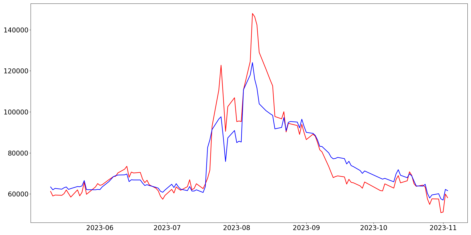 [ - : 실제값(종가) / - : 예측값(종가) ]