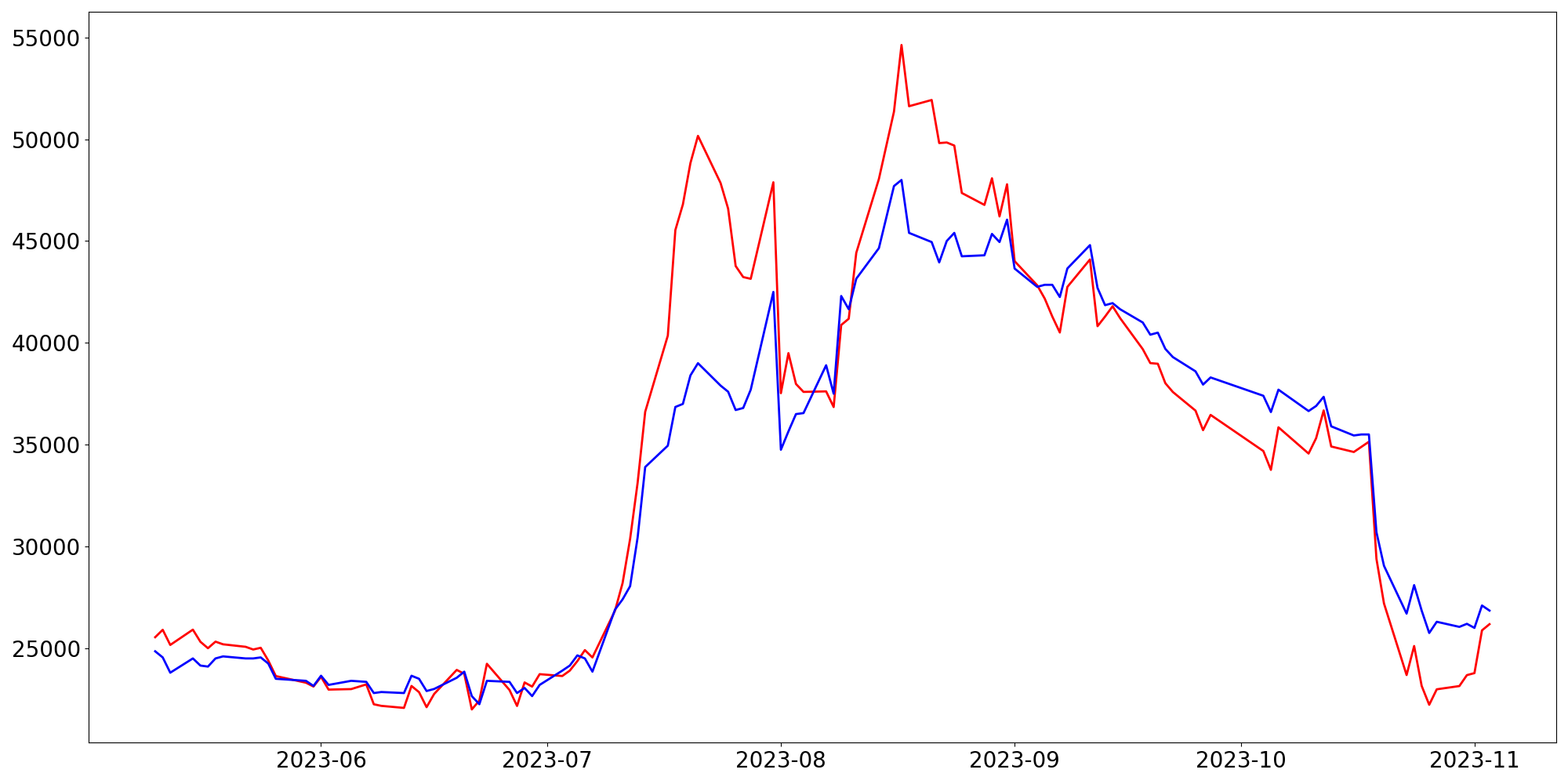 [ - : 실제값(종가) / - : 예측값(종가) ]