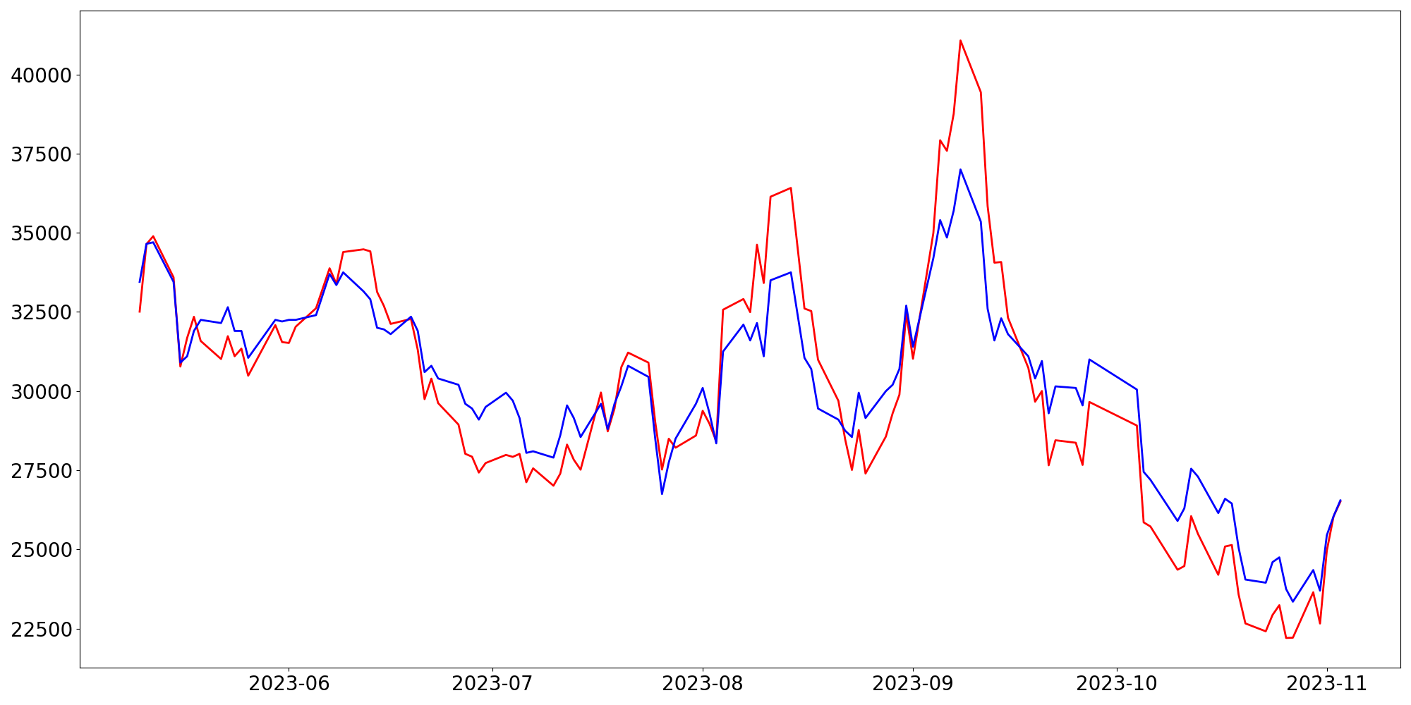 [ - : 실제값(종가) / - : 예측값(종가) ]