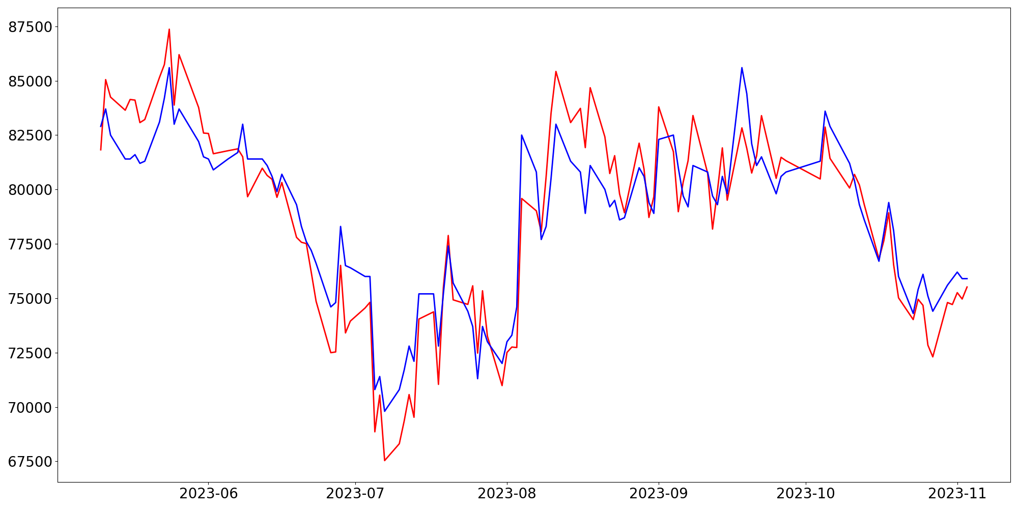 [ - : 실제값(종가) / - : 예측값(종가) ]