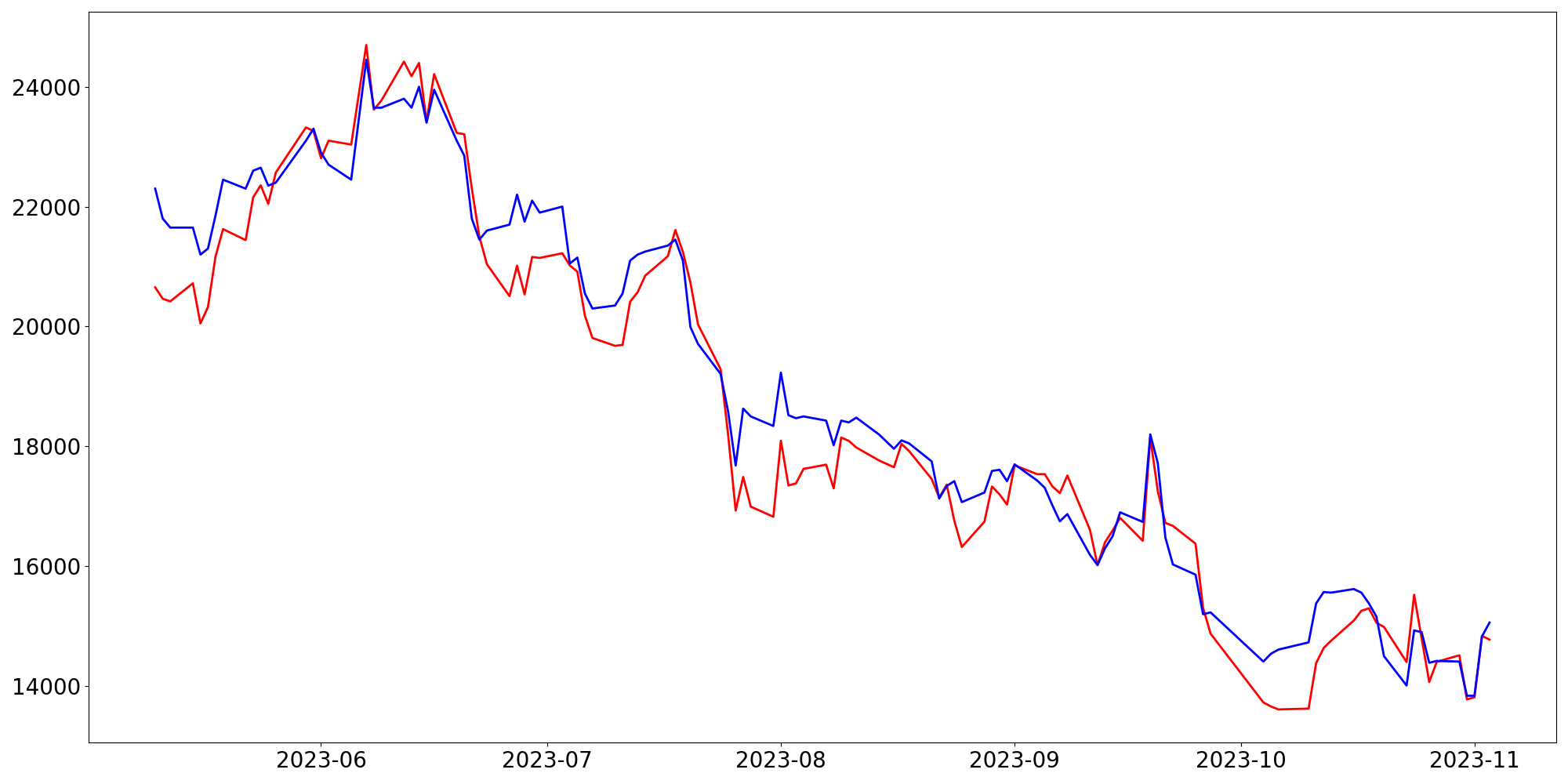[ - : 실제값(종가) / - : 예측값(종가) ]