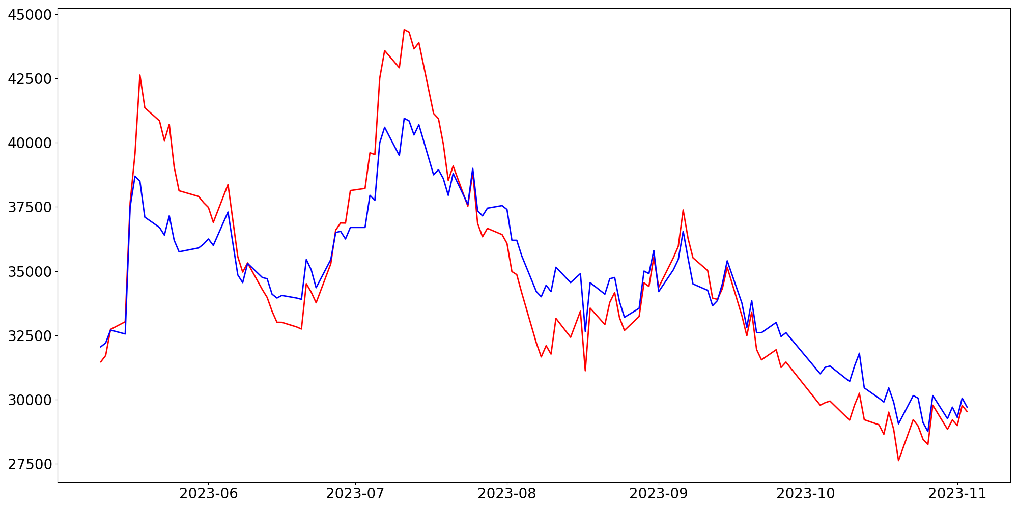 [ - : 실제값(종가) / - : 예측값(종가) ]