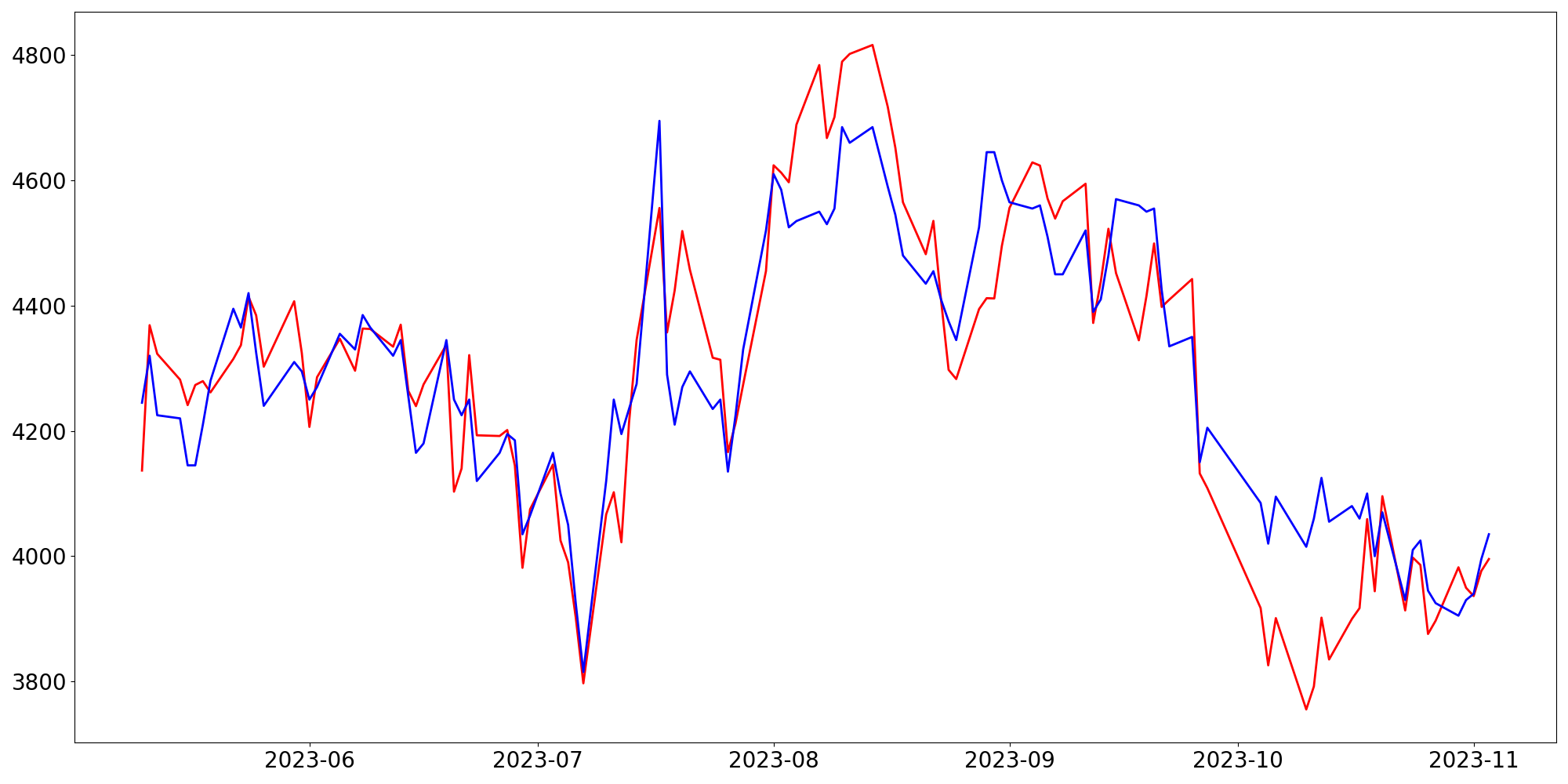 [ - : 실제값(종가) / - : 예측값(종가) ]
