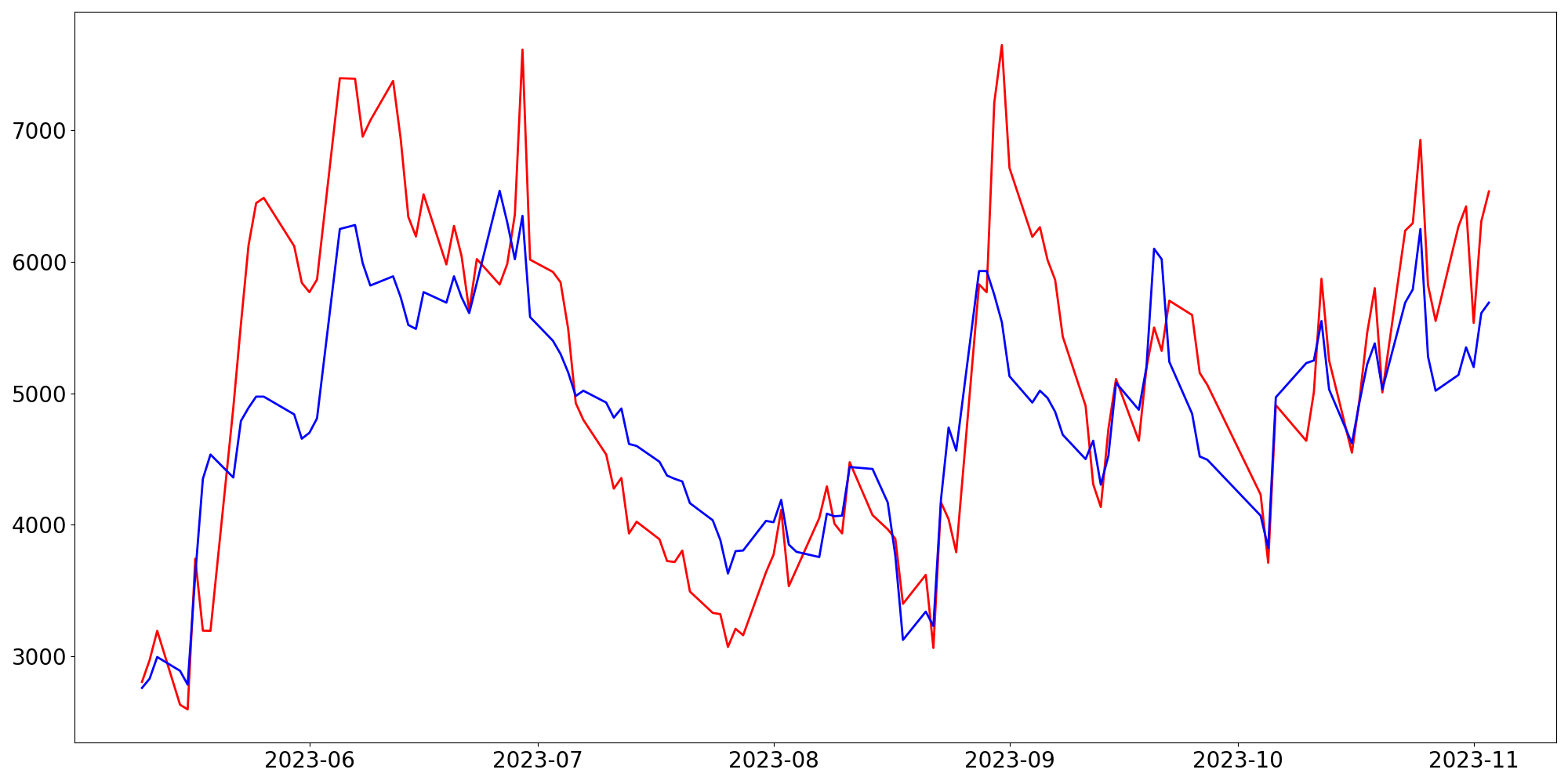[ - : 실제값(종가) / - : 예측값(종가) ]