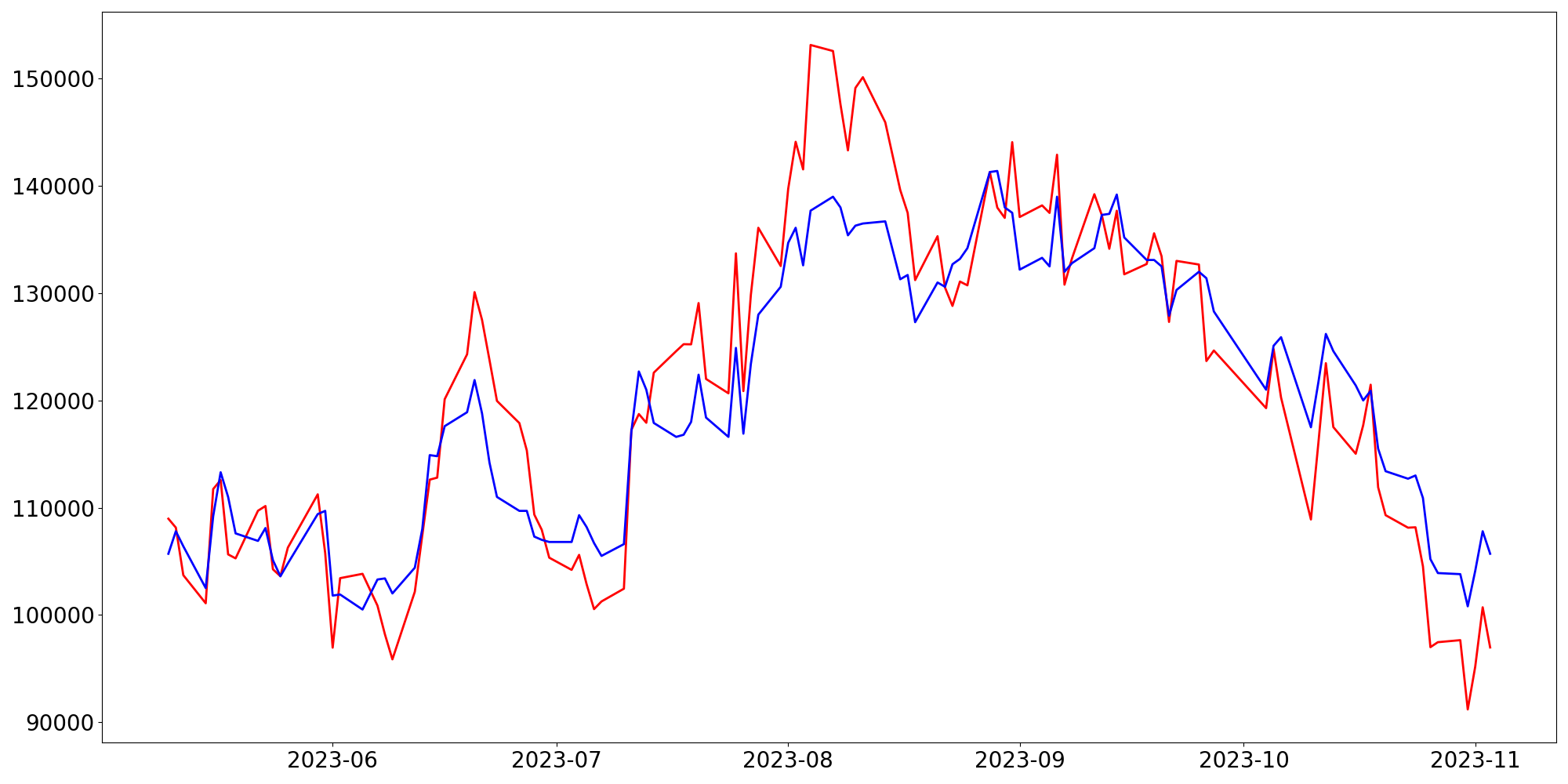 [ - : 실제값(종가) / - : 예측값(종가) ]
