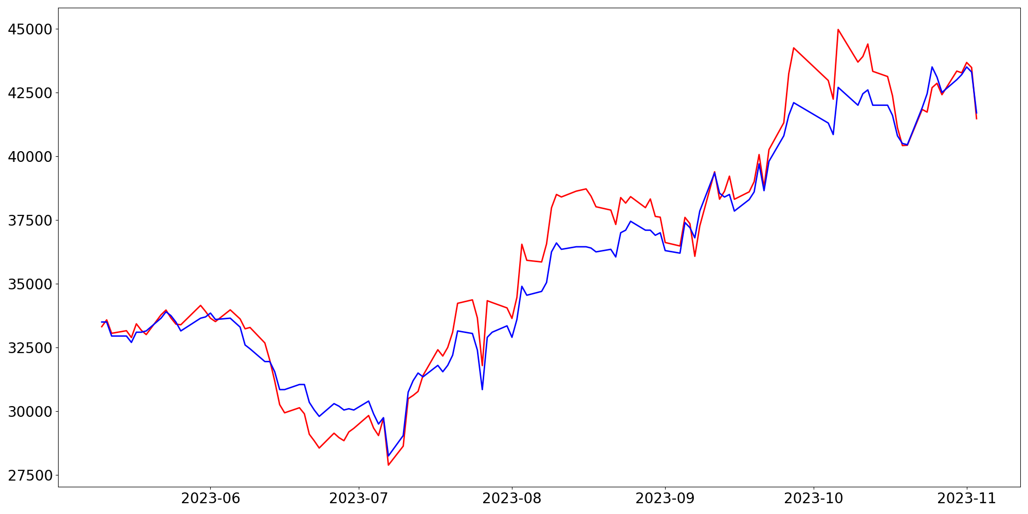 [ - : 실제값(종가) / - : 예측값(종가) ]