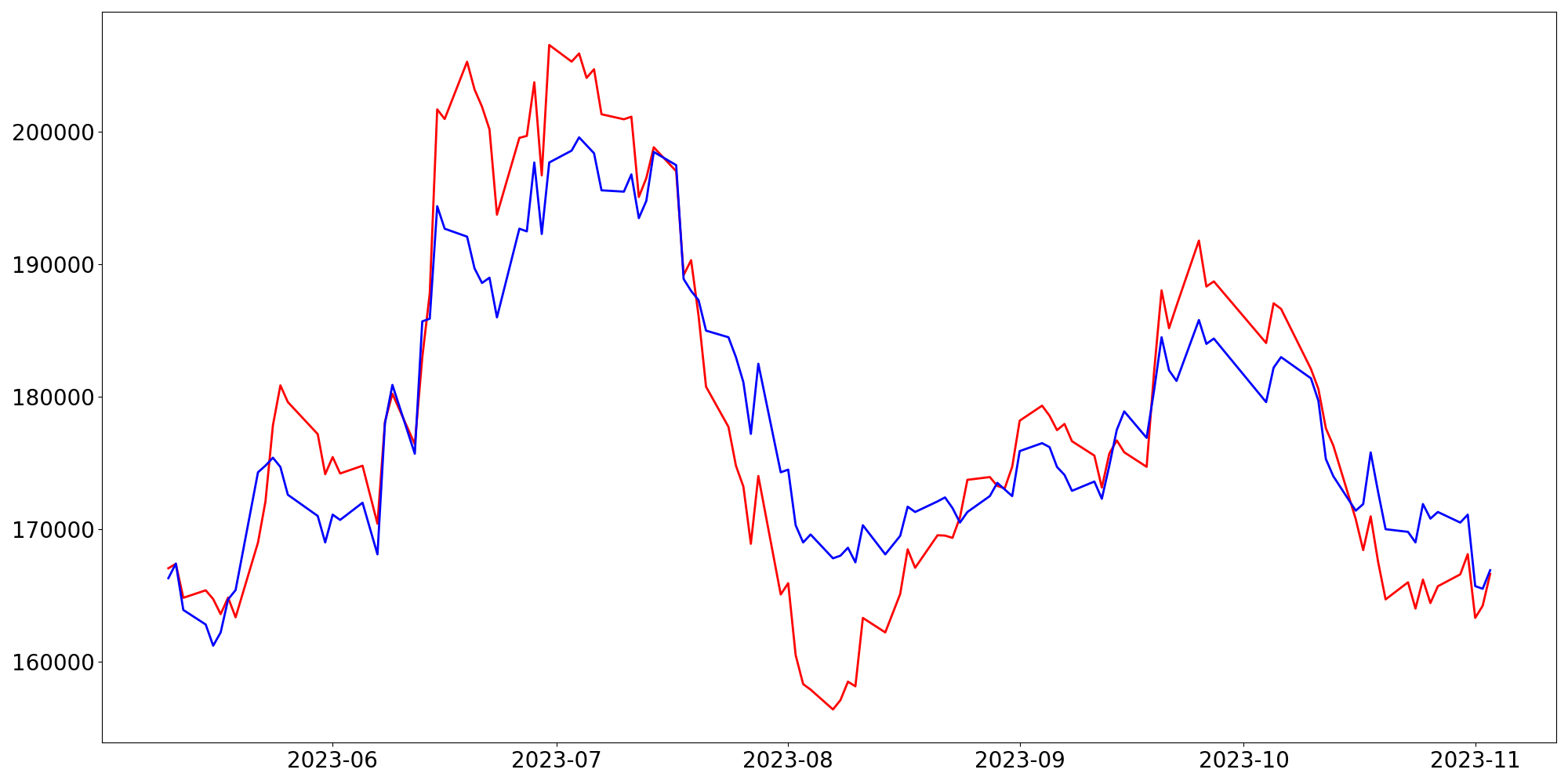 [ - : 실제값(종가) / - : 예측값(종가) ]