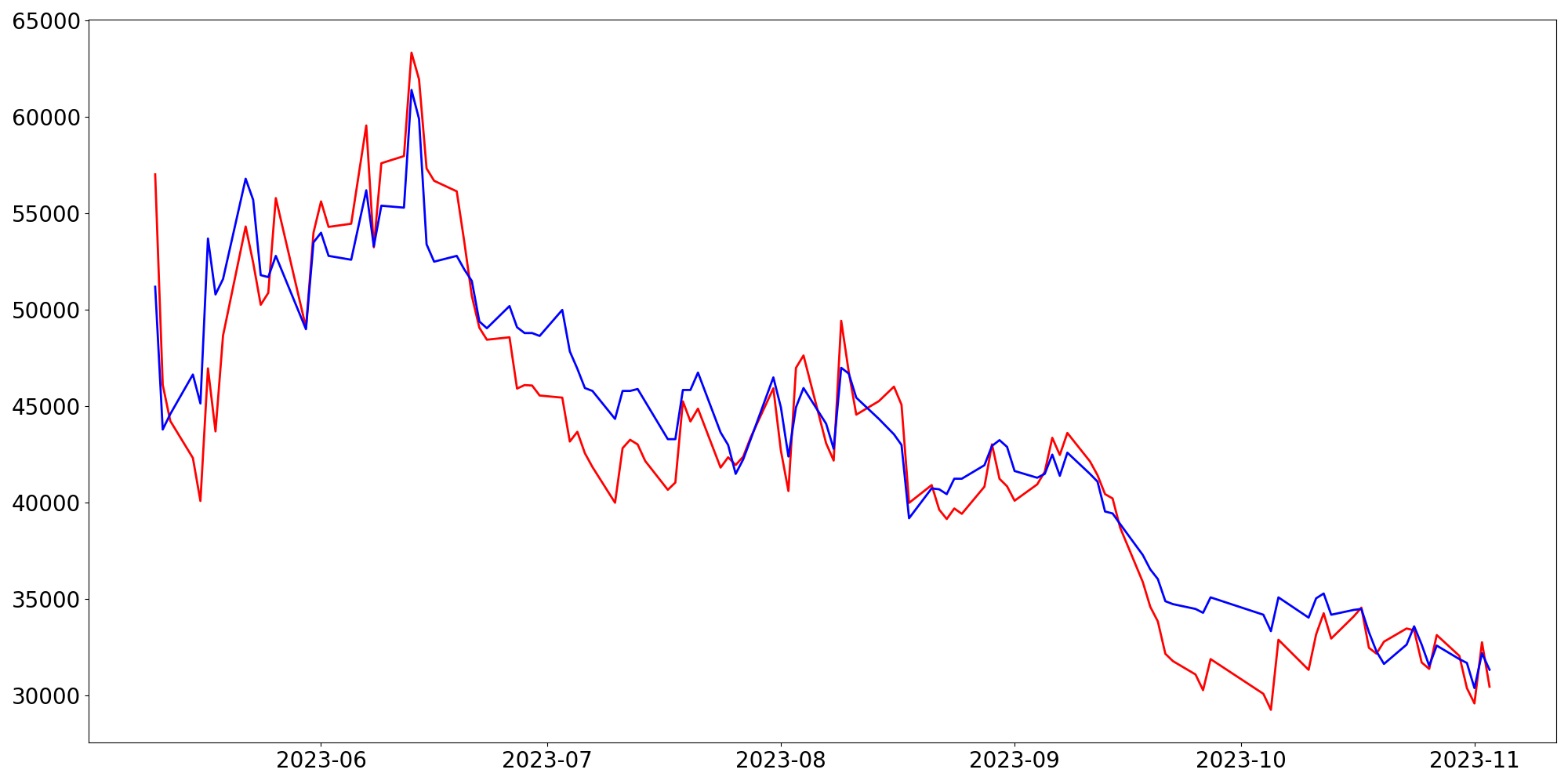 [ - : 실제값(종가) / - : 예측값(종가) ]