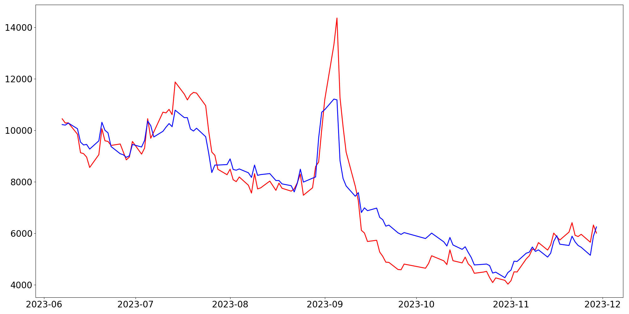 [ - : 실제값(종가) / - : 예측값(종가) ]
