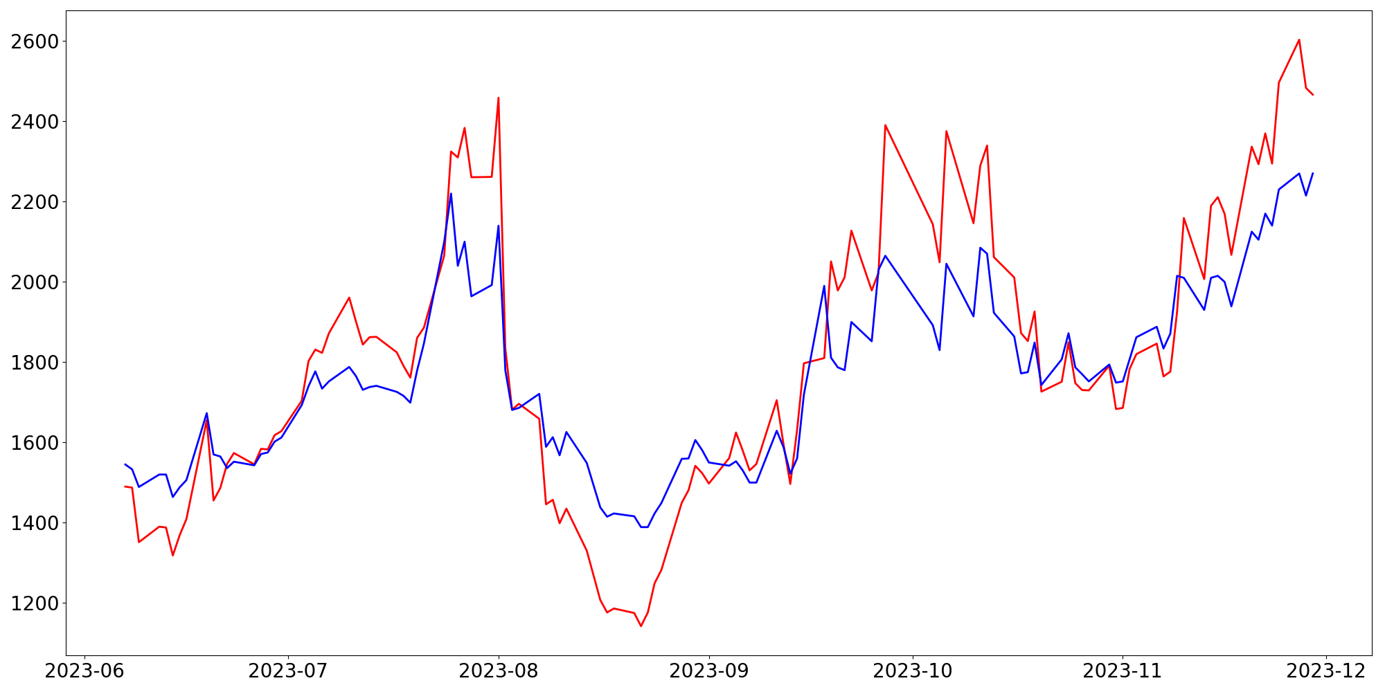 [ - : 실제값(종가) / - : 예측값(종가) ]