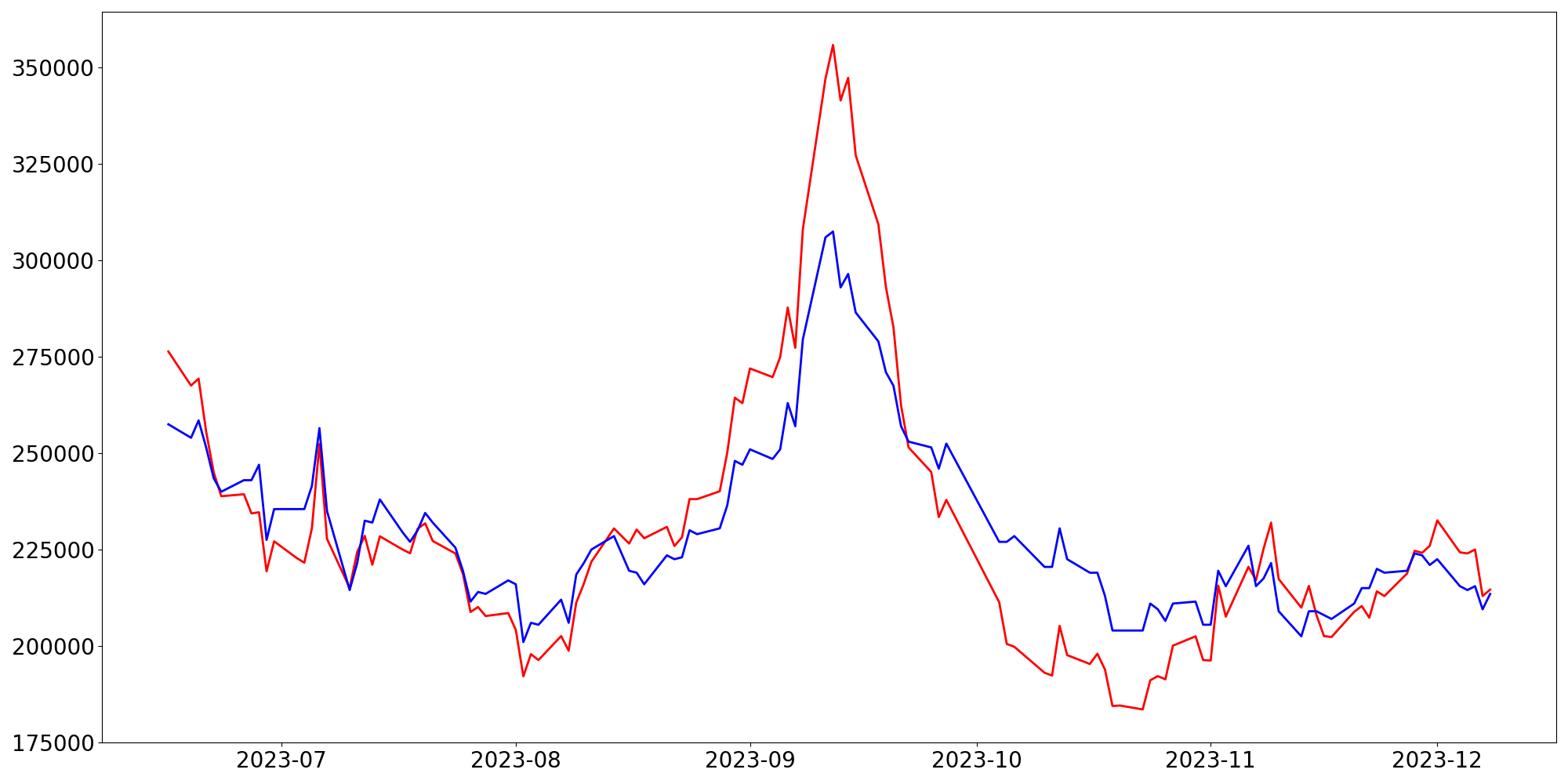 [ - : 실제값(종가) / - : 예측값(종가) ]