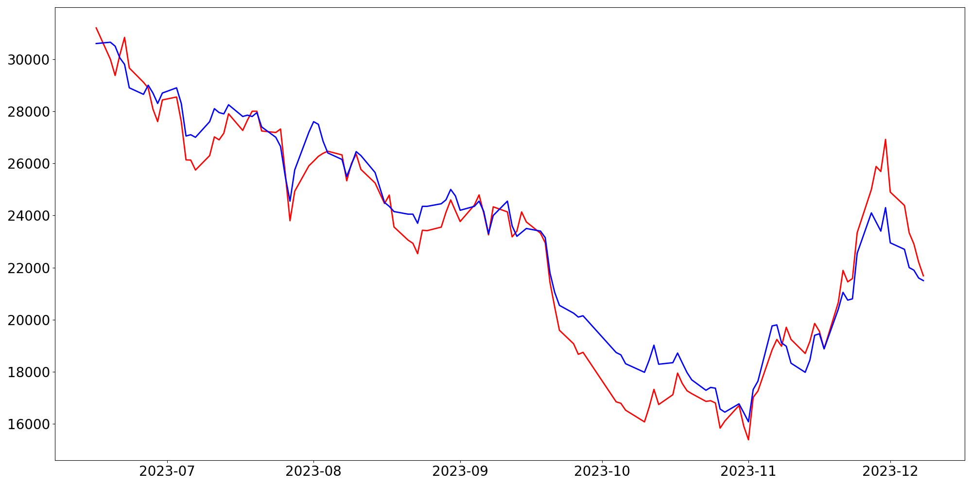 [ - : 실제값(종가) / - : 예측값(종가) ]