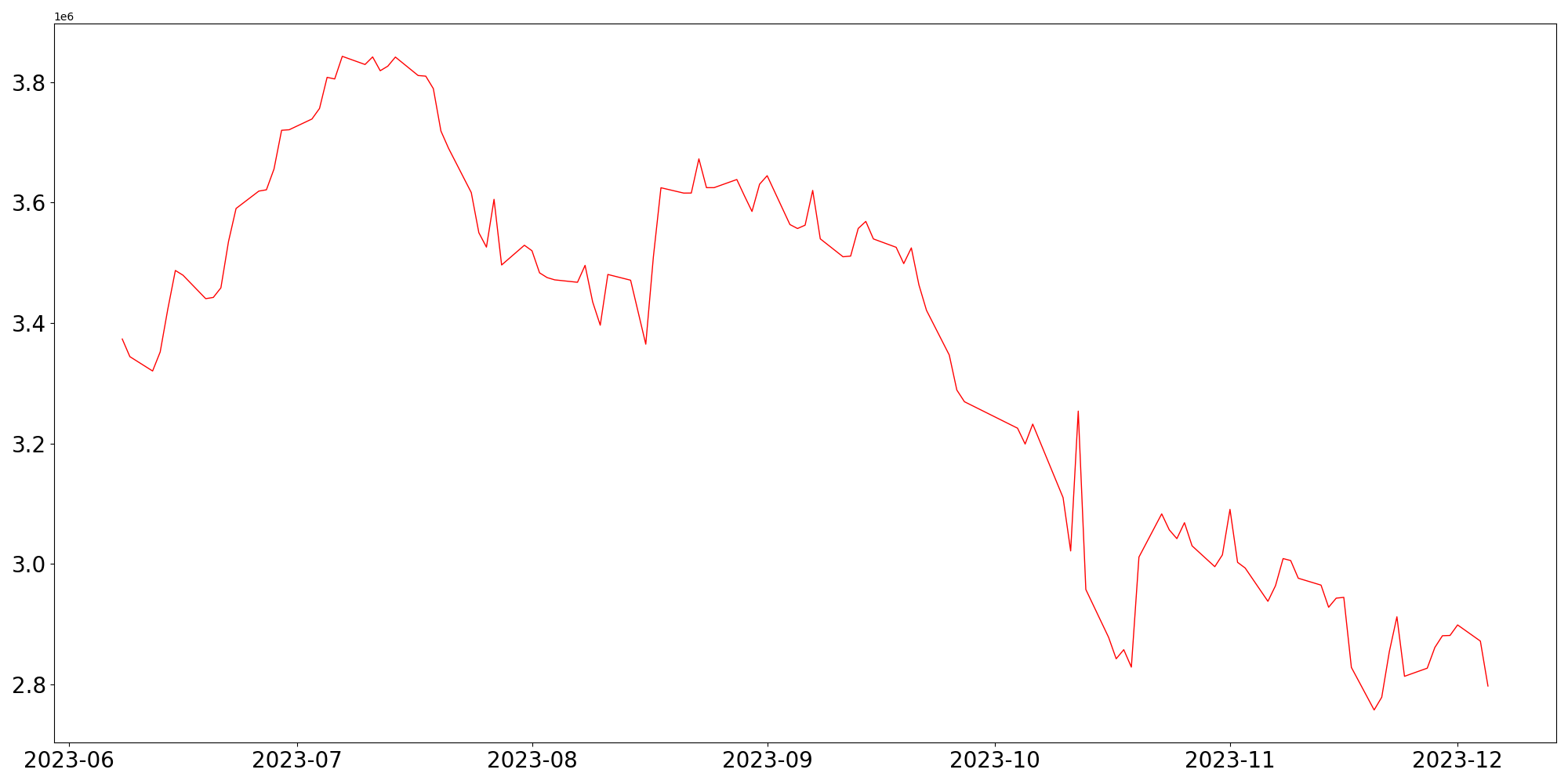 일별 공매도 거래량 추이를 그래프로 나타낸 것으로 공매도 거래량이 증가할 수록 단기적으로 가격 하락을 예측하는 시장참가자가 증거하는 것으로 판단해 볼 수 있습니다.