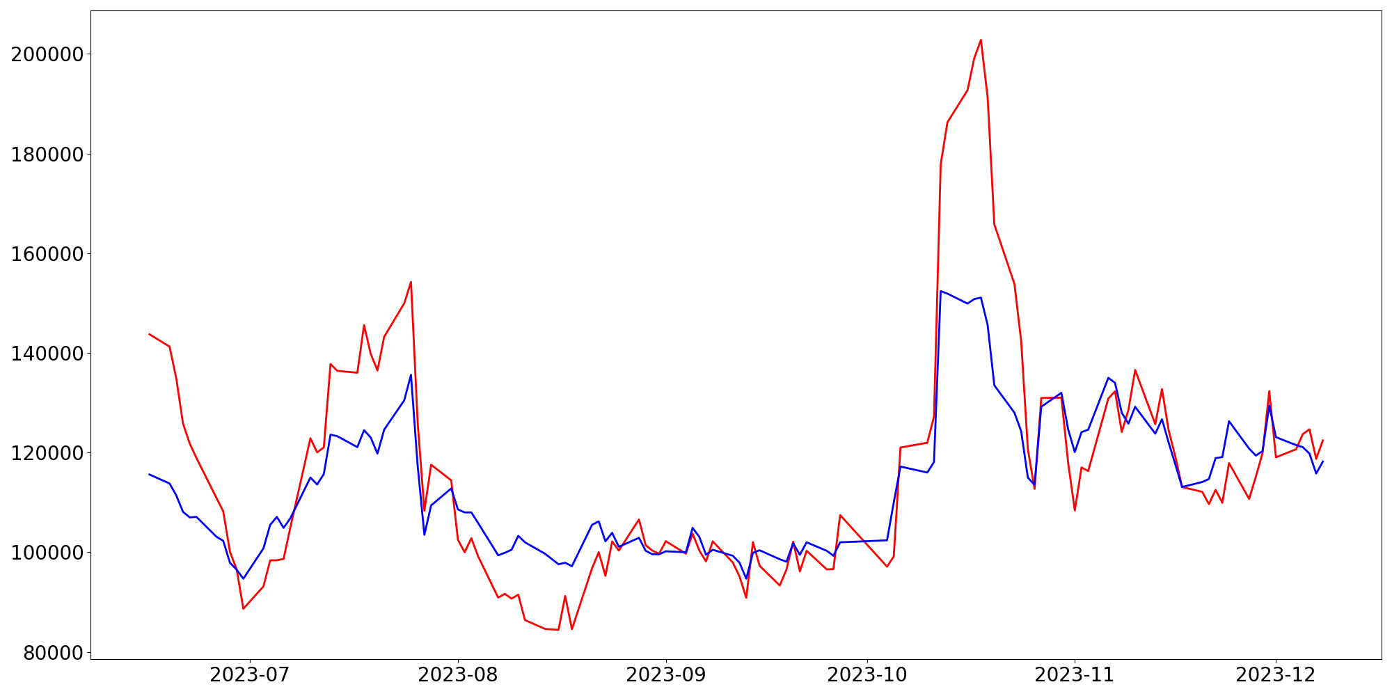 [ - : 실제값(종가) / - : 예측값(종가) ]