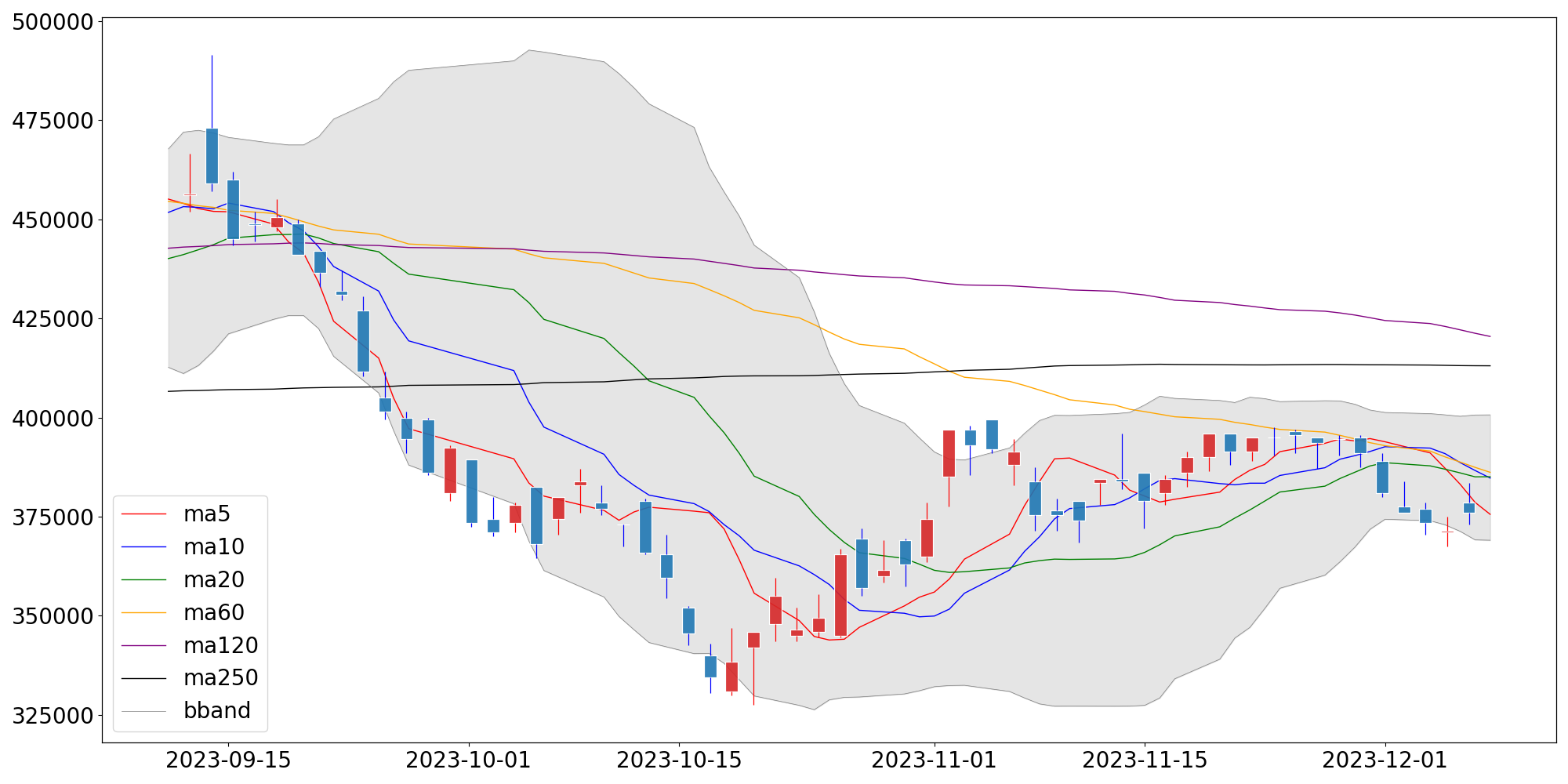 □ 중기 : 현재 종가가 중기(60일) 이동평균값(386,192원)을 하회 하여 중기적 추세 하락 중