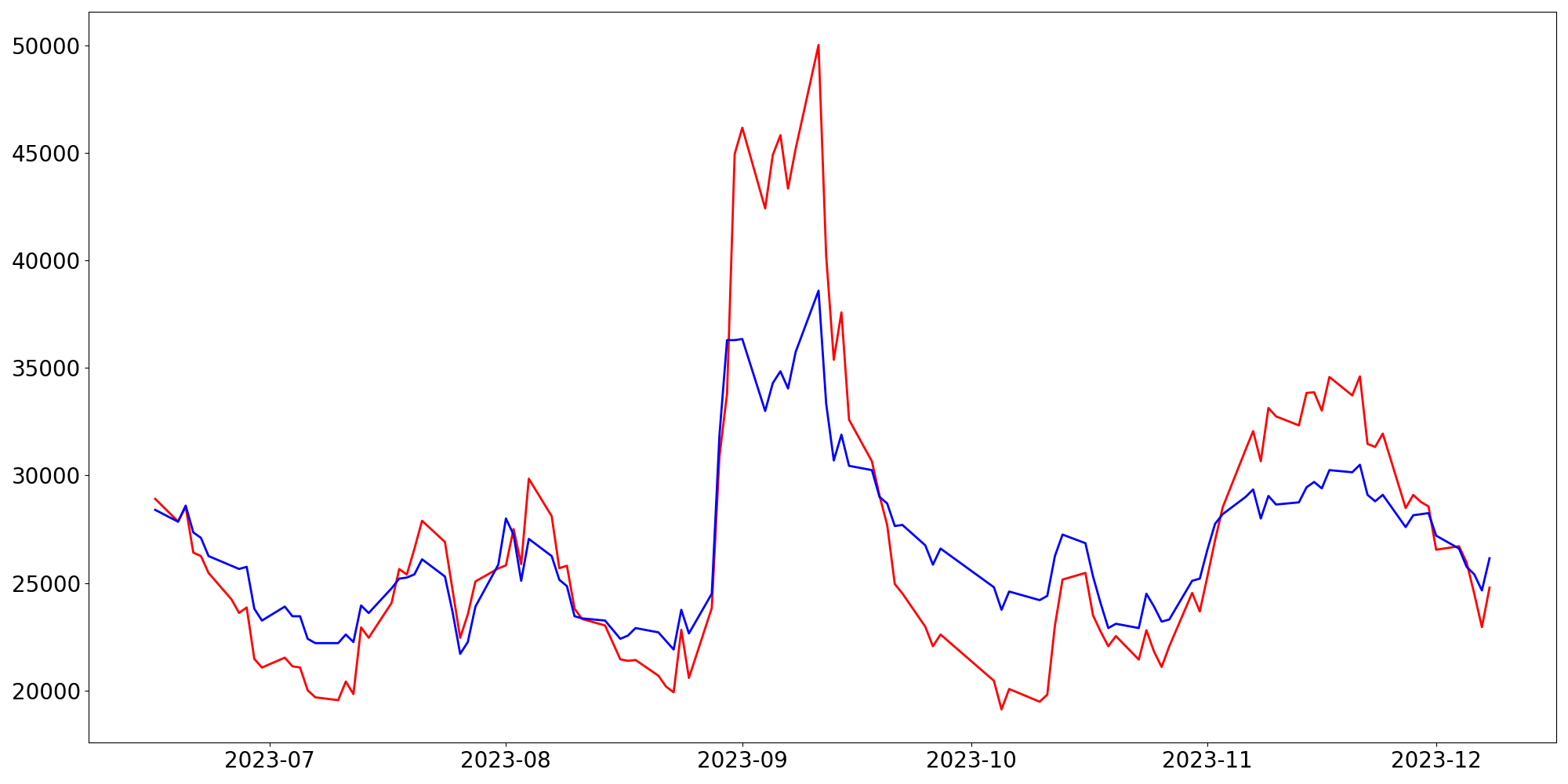 [ - : 실제값(종가) / - : 예측값(종가) ]