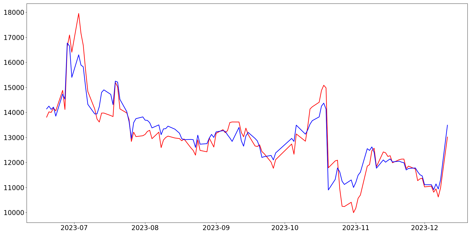 [ - : 실제값(종가) / - : 예측값(종가) ]