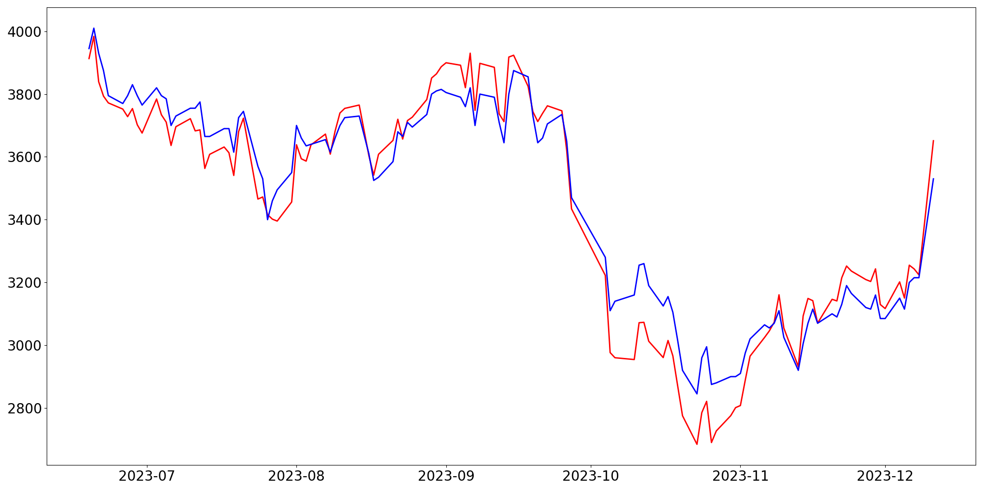 [ - : 실제값(종가) / - : 예측값(종가) ]
